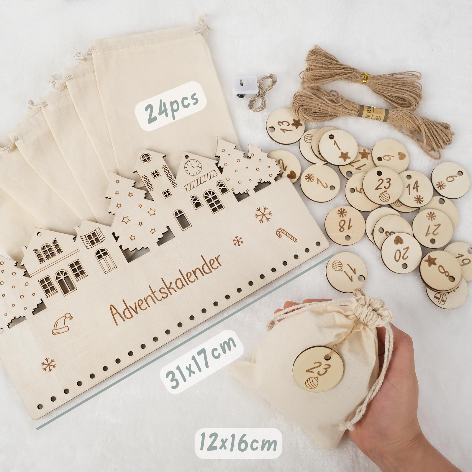 Mach die Weihnachtszeit zu etwas ganz Besonderem! Dieses wunderschöne 'I LOVE MOM' Adventskalender-Set enthält alles, was du brauchst: 24 festliche Papiertüten mit verschiedenen Weihnachtsmotiven, 2 Bogen mit Weihnachtsaufklebern, 2 Bogen mit Zahlen von 1-24, 24 Holzklammern und 10 Meter Juteseil. Einfach deine eigenen kleinen Geschenke in die Tüten füllen - ob Süßigkeiten, Mini-Spielzeuge, Kosmetik oder persönliche Botschaften. Mit den Holzklammern und dem Juteseil kannst du die Tüten ganz einfach aufhängen: am Kamin, an der Wand, am Weihnachtsbaum oder über der Tür. So wird das Warten auf Weihnachten für die ganze Familie zu einem riesen Spaß! Perfekt für Mama, aber auch für andere Familienmitglieder adaptierbar. Kreativ, persönlich und voller Weihnachtsmagie - viel schöner als gekaufte Kalender!