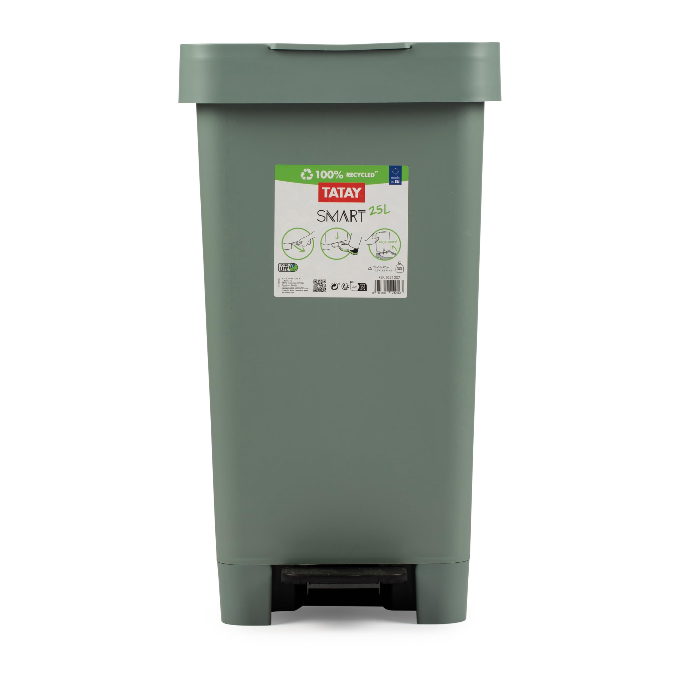 Der praktische Mülleimer für alle, die Wert auf Ordnung legen! Mit 25 Litern Volumen und cleverem Pedal-System öffnest du ihn ganz ohne Hände - super hygienisch! Passt perfekt in Küche, Vorratsraum oder sogar auf die Terrasse. Das coole Design ist nur 26x36x47 cm groß und spart echt Platz. Besonders smart: Die Halterillen fixieren auch 30-Liter-Beutel sicher, nichts rutscht mehr! Aus BPA-freiem, recyceltem Kunststoff - gut für die Umwelt und mega stabil. Der Deckel bleibt übrigens auch offen stehen, ideal zum Beutelwechseln. Einfach zu reinigen und wirklich langlebig. Made in Spain von TATAY, einer Marke mit 90 Jahren Erfahrung. Perfekt für dein persönliches Recycling-System!