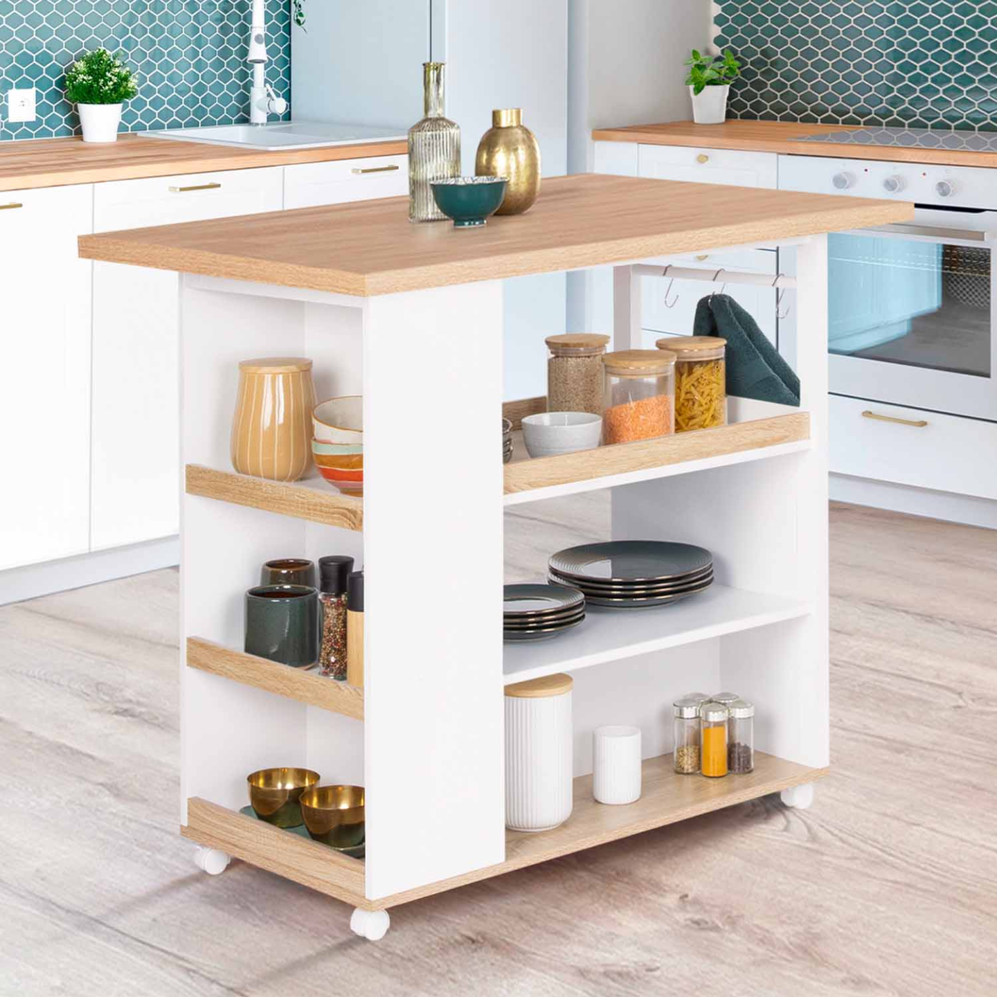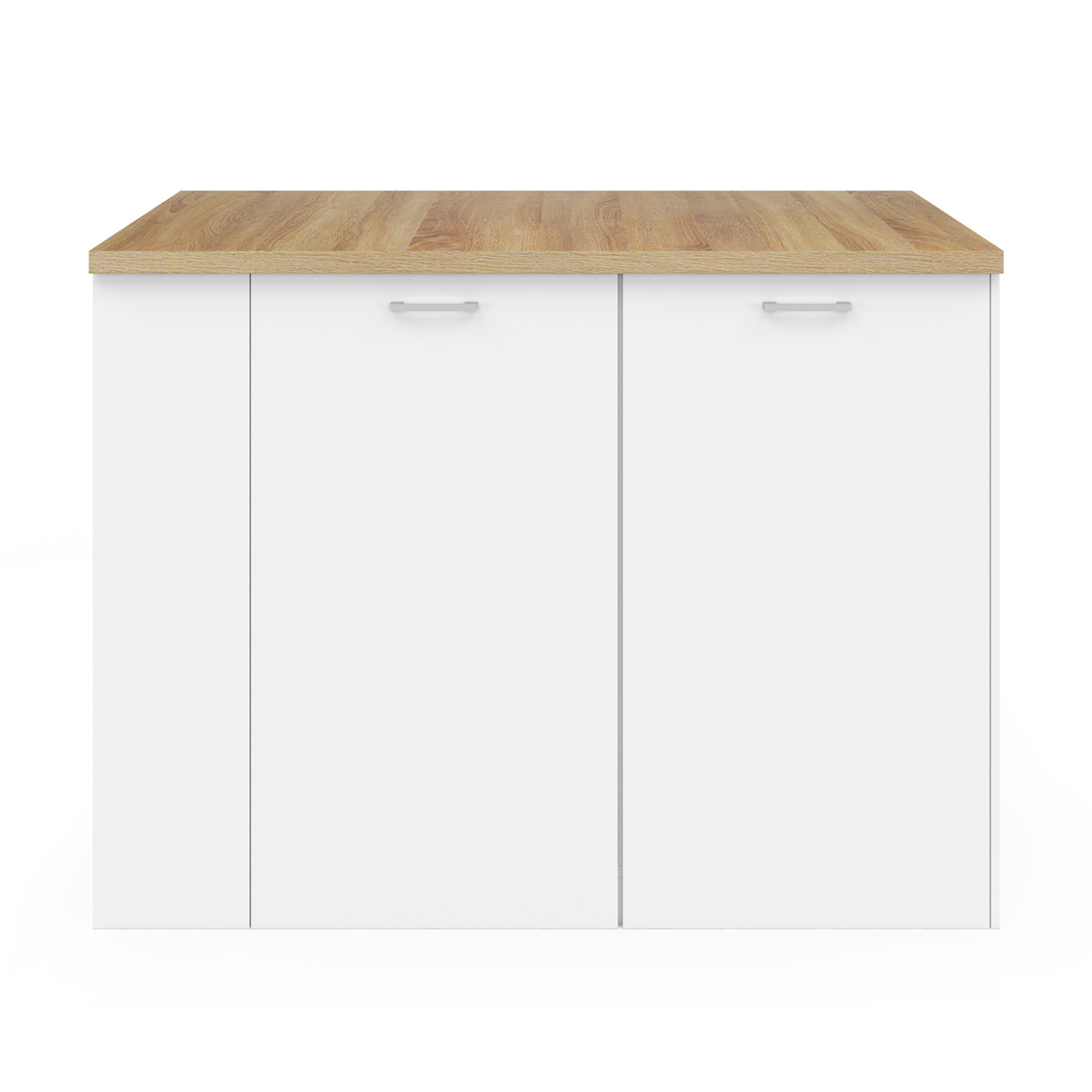 Moderne Kücheninsel die richtig was kann! Die TIBO Insel ist 120 cm lang und bietet jede Menge Stauraum. Mit Arbeitsplatte in trendiger Betonoptik, 2 Seitentüren und praktischen Ablagen. Ideal für kleine Küchen - strukturiert den Raum optimal. Dient als Stehtisch, Arbeitsfläche und Aufbewahrungsmöbel in einem. Aus stabilen melaminbeschichteten Spanplatten, selbst zu montieren. Maße: 120x70x90 cm. Bringt Ordnung und Style in deine Küche!