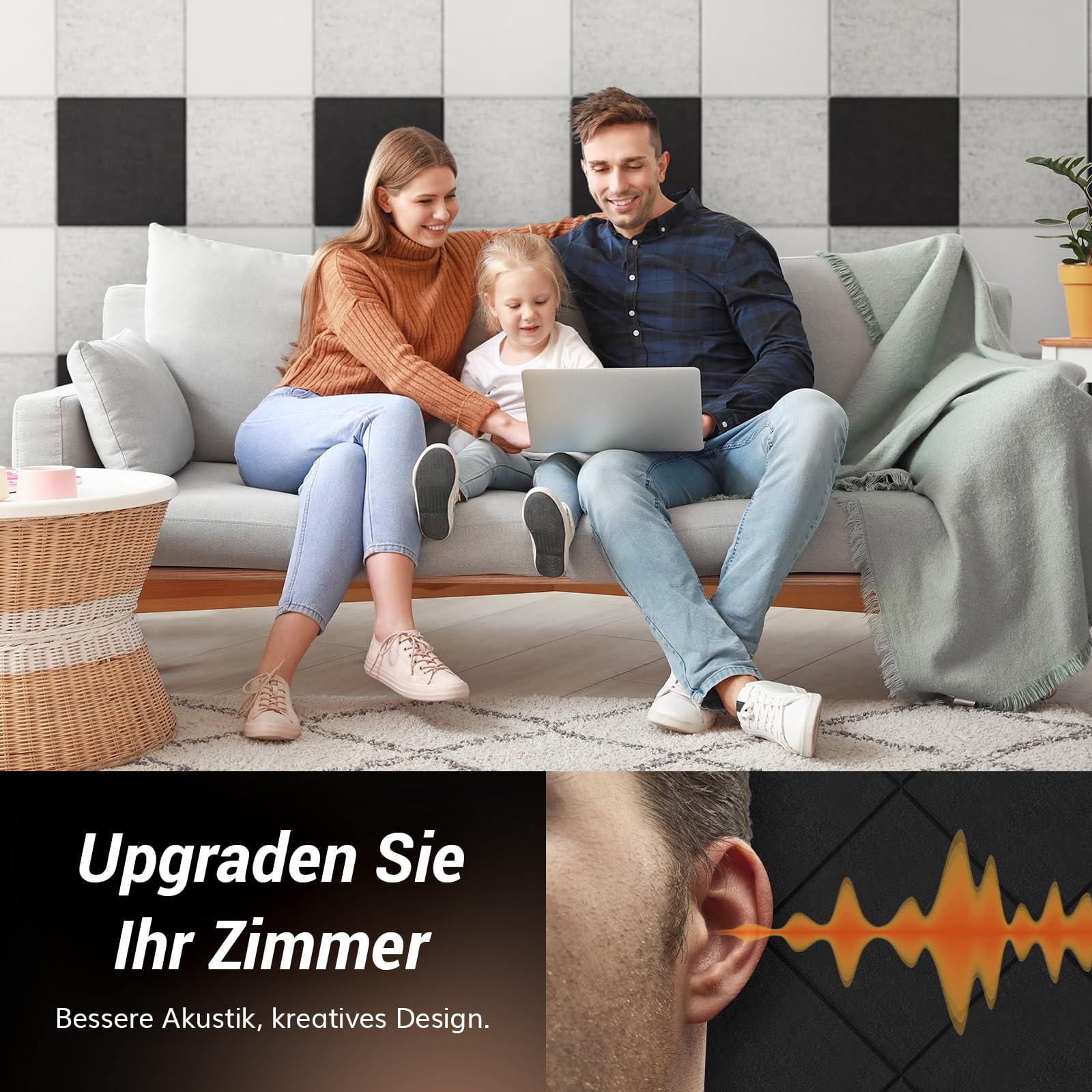Hast du Probleme mit Hall oder Lärm in deinem Raum? Diese TONOR Akustikplatten sind die Lösung! 54 Stück im Set, je 30x30x0,9cm groß. Aus 100% Polyesterfaser mit hoher Dichte (1700 gsm²) - die schlucken 90% der Geräusche und 97% der Echos! Super einfach zu montieren: Selbstklebend, einfach Schutzfolie abziehen und an die Wand drücken. Kein Extra-Kleber nötig! Sieht auch noch gut aus - schwarze, glatte Oberfläche passt in jedes Interior. Sicher und gesund: geruchlos, ungiftig, rutschfest. Perfekt für Aufnahmestudios, Home-Office, Spielzimmer, Wohnzimmer - überall, wo du Ruhe brauchst. Mach aus deinem Raum eine Oase der Konzentration! Einfach die Platten kreativ anordnen - schon hast du bessere Akustik und weniger Stress mit den Nachbarn.