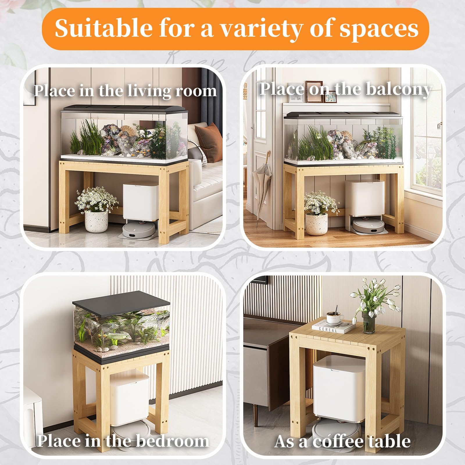 Sicherer Stand für dein Aquarium oder Terrarium! Dieser massive Holzständer in 40x40x50cm ist super stabil und trägt problemlos schwere Becken. Aus hochwertigem Massivholz gefertigt, das feuchtigkeitsresistent und extrem langlebig ist. Die erhöhte Tischplatte gibt dir perfekte Sicht auf deine Fische oder Reptilien. Unten bietet ein praktischer Stauraum Platz für Futter, Zubehör und Reinigungsutensilien. Die rutschfesten Fußpolster schützen deinen Boden und sorgen für stabilen Stand. Kompakt genug für Wohnzimmer, Büro oder Balkon - und sieht dabei noch richtig gut aus!