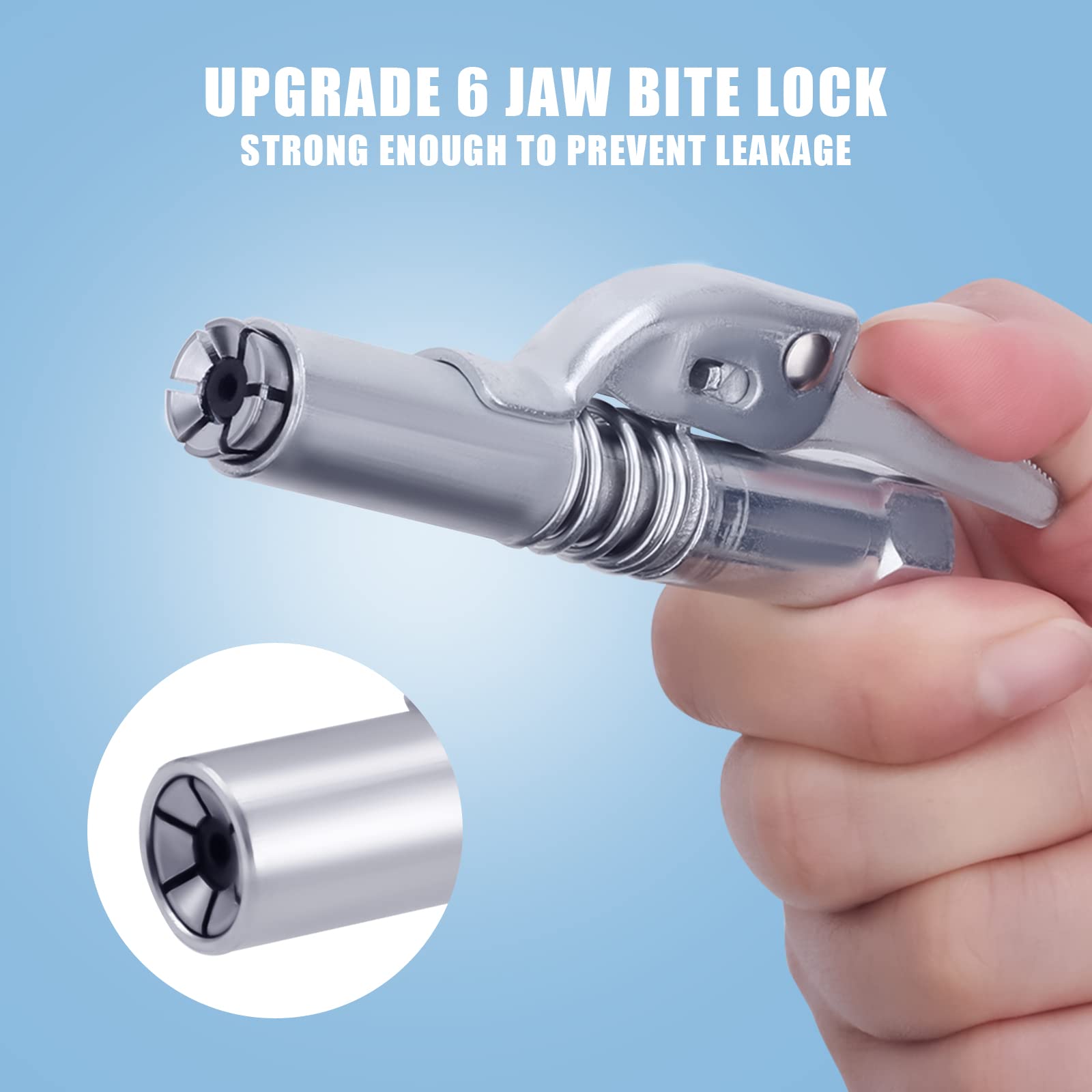 Professionelles Schmiern war noch nie so einfach! Diese 4 Fettpresse-Mundstücke passen auf alle gängigen 1/8\ NPT Gewinde. Die 4-Backen-Verriegelung sorgt für sicheren Halt, die Gummidichtung verhindert lästiges Fettlaufen. Bis 10.000 PSI belastbar - ideal für Auto, Landwirtschaft oder Industrie. Im praktischen 4er-Set bist du für jeden Einsatz gerüstet!