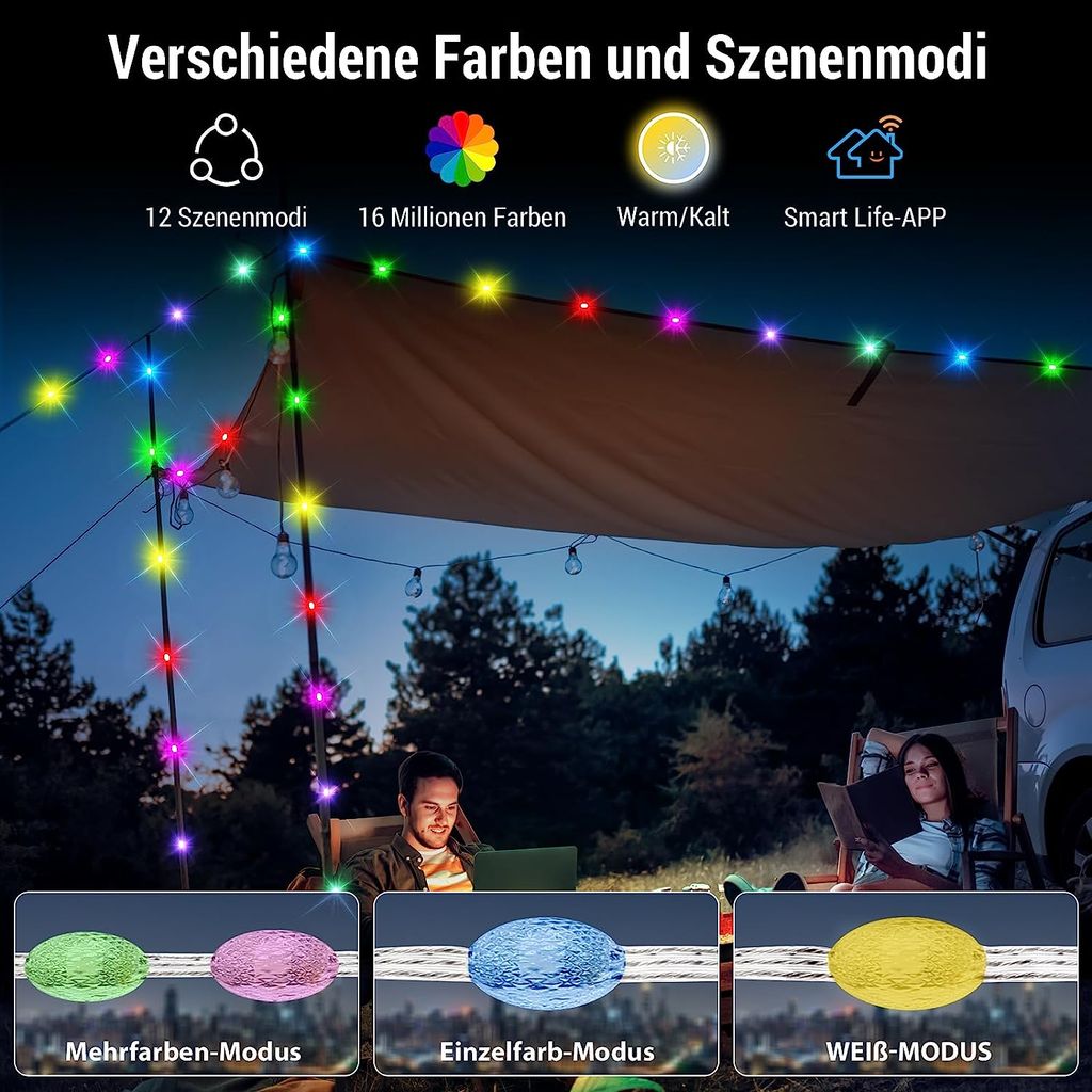 Coole Stimmung für Camping, Garten und Party! Diese 2 Lichterketten von TRIROCKS bringen Farbe in jede Location. Jede Kette ist 8 Meter lang mit bunten LEDs in rot, gelb, blau und grün. 5 verschiedene Lichtmodi: Dauerlicht, Atmen, Blinken und mehr. IPX4 wasserdicht - hält auch mal einem Regenschauer stand. Aus robustem ABS und PC Material, ideal für draußen. Kompakt zusammenrollbar (nur 9x5cm), super zum Mitnehmen. Einfach ausziehen, einschalten und die Stimmung genießen. Perfekt für Zelt, Wohnwagen, Balkon, Geburtstagsfeier oder gemütliche Abende im Garten. Batteriebetrieben - völlig unabhängig von Steckdosen. Einfach Stimmung pur!