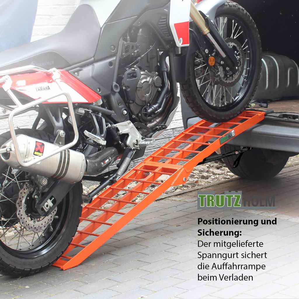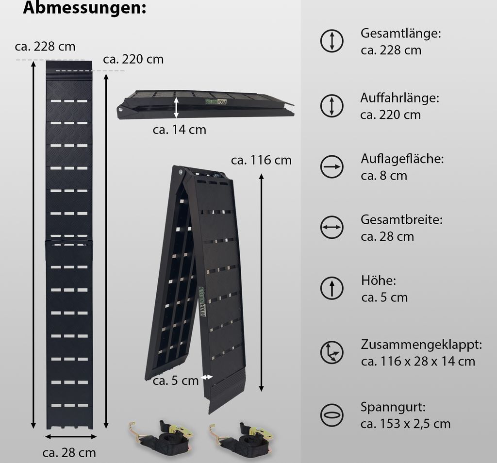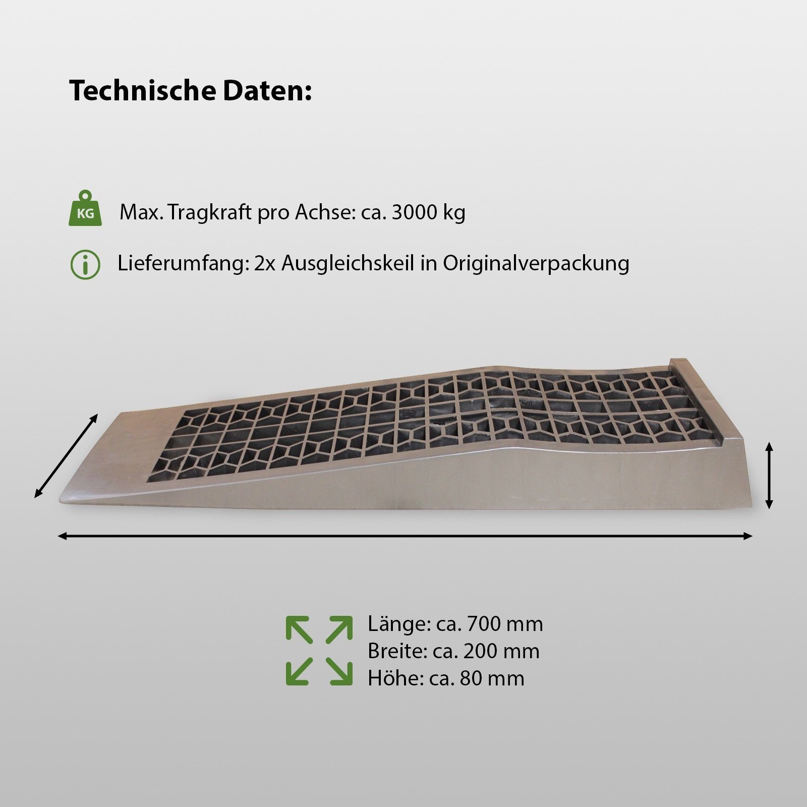 Jede Rampe 70x20x8cm groß, zusammen bis zu 5 Tonnen Traglast. Aus robustem Kunststoff, nur 1,6kg leicht. Rutschfeste Oberfläche und Überfahrstopper für maximale Sicherheit.