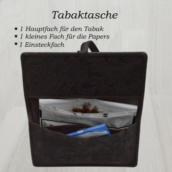 Richtig stylische Tabaktasche aus Kunstleder im Vintage-Design! Mit den Maßen 16x8,5x2 cm (gefaltet) ist sie kompakt genug für jede Tasche, aber groß genug für all deine Rauchutensilien!