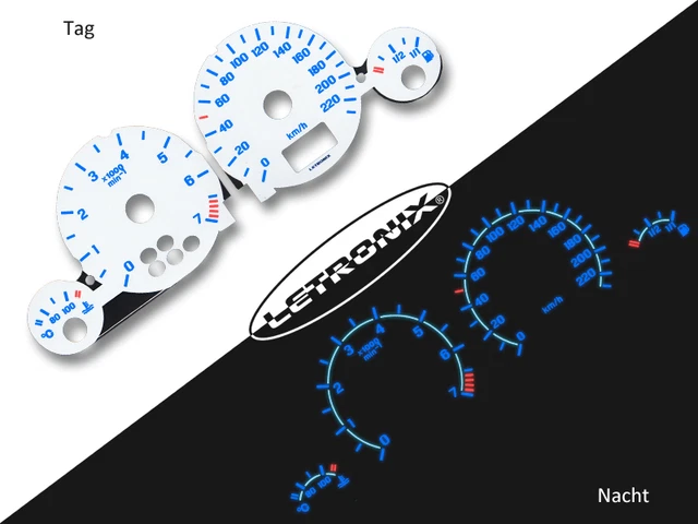Verpasse deinem Opel Astra F oder Vectra A mit diesen Plasma-Tachoscheiben von LETRONIX einen individuellen Look! Die selbstleuchtenden Scheiben zeigen 20-220 km/h und 7000 U/min im sportlichen Design. Einfacher Einbau - einfach die originalen Tachoscheiben gegen die neuen austauschen und den mitgelieferten Inverter an Plus und Minus anschließen. Am Inverter kannst du Helligkeit und Farbton perfekt auf deine Instrumentenbeleuchtung abstimmen. 100% passgenau und eintragungsfrei - keine Fehlermeldungen garantiert. Mit 50.000 Stunden Lebensdauer und für 12V Bordspannung geeignet. Deutsche Qualität von LETRONIX - da weißt du, was du kaufst. Einfach umbauen und sich über den fresh look freuen - dein Auto sieht sofort wie neu aus! Check vor dem Kauf aber unbedingt, ob die abgebildeten Scheiben zu deinem Original-Tacho passen.