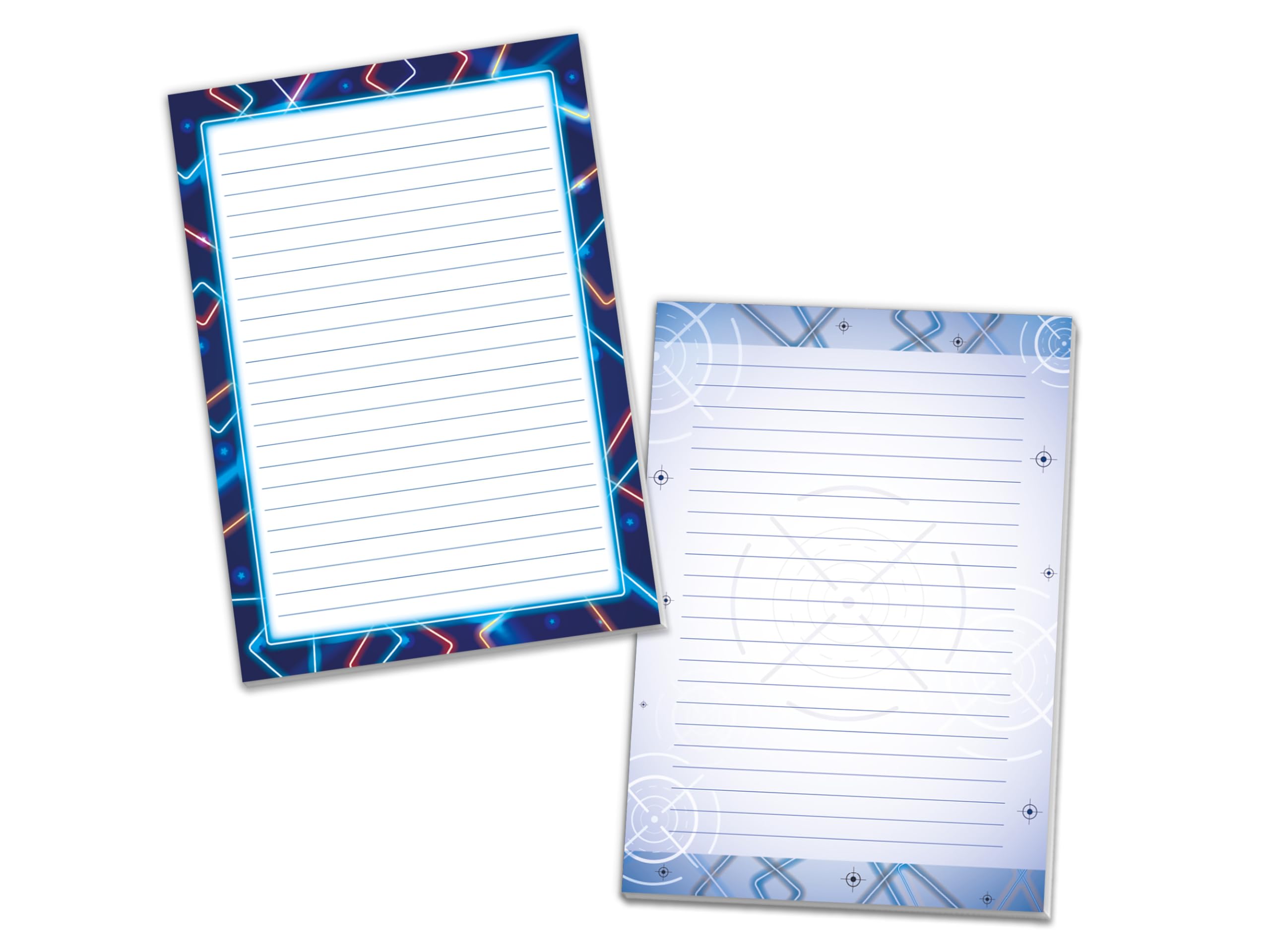 Wow, mit diesen coolen Laser Tag Schreibblöcken macht Hausaufgaben machen gleich doppelt so viel Spaß! Im Set sind zwei verschiedene Blöcke dabei - einer in dunklen, einer in hellen Neon-Farben, beide mit ultra-stylischem Laser-Strahl-Design. Jeder Block hat 25 linierte Blätter im A4-Format (21,0 x 29,7 cm) aus festem 80g Papier.