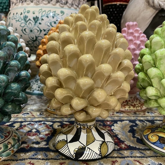 Dieser wunderschöne sizilianische Tannenzapfen aus Caltagirone-Keramik ist nicht nur eine Augenweide, sondern auch ein traditionelles Symbol für Glück und Schutz! Handgefertigt und handbemalt in leuchtendem Antikblau, ist jedes Stück ein Unikat mit seinem eigenen Charakter. Mit 25cm Höhe und 15cm Durchmesser macht er auf jedem Regal, Sideboard oder Balkon eine tolle Figur. Die typischen Majolika-Dekorationen und die liebevolle Verarbeitung zeugen von echtem sizilianischem Kunsthandwerk. Perfekt als besonderes Geschenk für Hochzeiten, Einweihungen oder Jubiläen - oder einfach als Glücksbringer für dein Zuhause. Ein Stück süditalienische Tradition, das deine Räume sofort aufwertet!
