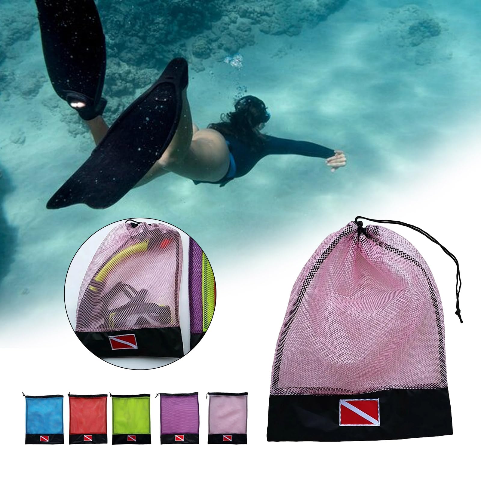 Hey, diese Tauchnetz-Tasche von NVOQILIN ist der absolute Game-Changer für alle Wasserratten! Perfekt für Taucher, Schnorchler und Strandfans - die Tasche aus robustem Nylon-Netzgewebe trocknet superschnell und wiegt nur 55 Gramm. Mit den Maßen 40x32 cm passt da deine ganze Ausrüstung rein: Schnorchel, Brille, was auch immer du brauchst. Der verstellbare Kordelzug-Verschluss sorgt dafür, dass nichts verloren geht. Und die Ecken sind extra verstärkt - das Ding hält ewig! Es gibt sie in verschiedenen Farben (Rot, Grün, Pink, Lila, Blau, Schwarz), sodass du deine Sachen sofort wiedererkennst. Ob beim Tauchen, Schnorcheln oder einfach nur am Strand - diese praktische Tasche ist dein bester Begleiter für alle Wassersport-Aktivitäten!