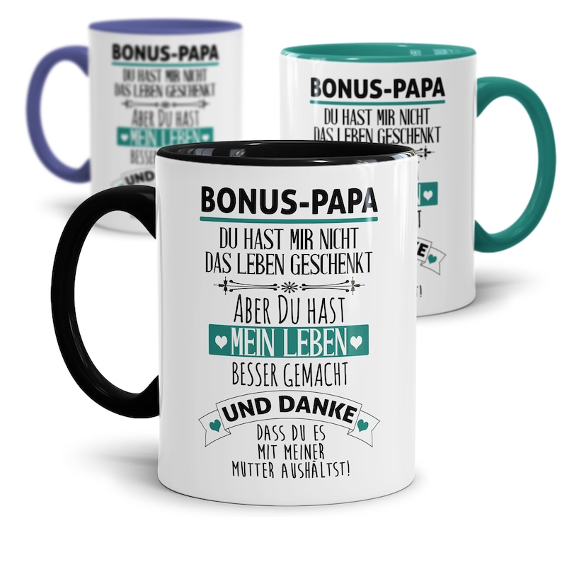 Diese Tasse ist das perfekte Geschenk für den Bonus-Papa! Mit dem süßen Spruch 'Bonus Papa, du hast mein Leben erhellt. Danke, dass du es mit meiner Mutter aushältst!' zeigst du ihm, wie sehr er geschätzt wird. Die 330ml Fassungsvermögen sind ideal für Kaffee, Tee oder heiße Schokolade. Der übergroße C-förmige Griff liegt super in der Hand. Ob zum Vatertag, Geburtstag, Weihnachten oder einfach so - diese Tasse kommt immer gut an! Sie ist innen und außen glatt und lässt sich leicht von Hand reinigen (nicht spülmaschinenfest). Ein persönliches und witziges Geschenk, das garantiert für ein Lächeln sorgt!