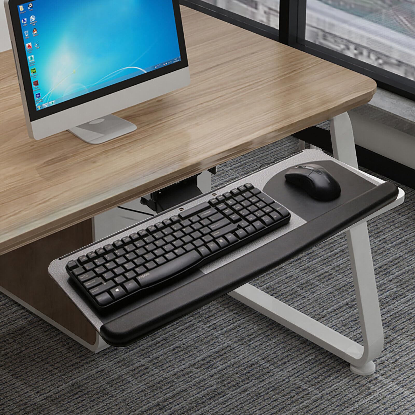 Diese höhenverstellbare Tastaturablage macht jeden Schreibtisch ergonomischer! Mit 65x25,5cm Größe bietet sie Platz für Tastatur, Maus und Kleinkram. Die Höhe lässt sich stufenlos einstellen, genauso wie der Winkel - bis zu 360° drehbar! Aus hochwertigem kaltgewalztem Stahlblech mit 3,0mm Stärke und bis zu 50kg Belastung. Die 300mm Gleitschienen laufen super leicht und wenn du nicht tippst, schiebst du sie einfach unter den Tisch. Perfekt fürs Büro, Homeoffice oder Gaming-Setup. Einfache Montage ohne Spezialwerkzeug - alles dabei. Macht das Tippen viel angenehmer und beugt Rückenproblemen vor. Endlich mehr Platz auf dem Schreibtisch und eine gesündere Sitzposition!
