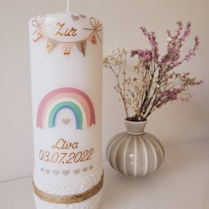 Eine bleibende Erinnerung an den Tauftag! Diese handgemachte Taufkerze wird persönlich für dich angefertigt.\n\nKerzen-Details:\n• Größe: ca. 25 x 7 cm\n• Farbe: Weißer Rohling\n• Verzierung: Gelb, Hellrot, Flieder, Kobaltblau, Mint\n• Schrift: Silber (Blockschrift 2)\n\nIndividualisierung:\n• Wähle Kerzengröße\n• Wähle Schriftart\n• Wähle Rohling-Farbe\n• Wähle Schrift- und Umrandungsfarbe\n• Persönlicher Name und Datum\n\nWarum meinkerzenshop?\n• Liebevolle Handarbeit\n• Hochwertige Materialien (RAL Standard)\n• Jede Kerze ein Unikat\n• Deutsche Qualität\n\nZusätzlich erhältlich:\n• Taufspruch-Kärtchen\n• Kerzenteller\n• Aufbewahrungsbox\n• Eilanfertigung\n\nZünde die Kerze jedes Jahr am Tauftag oder Geburtstag an - eine Tradition die bleibt!