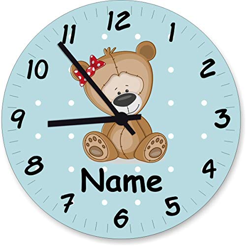 So süß! Diese handgefertigte Wanduhr mit Teddy Bär Motiv wird zum absoluten Highlight im Kinderzimmer. Aus ökologisch unbedenklichem Hartfaser, Ø 29cm. Inklusive Uhrwerk und Zeigern - nur Batterien fehlen noch. Du kannst sie mit dem Wunschnamen deines Kindes personalisieren! Perfekt als Geschenk zur Geburt, Taufe oder Geburtstag. Die bunten Farben sind nach Öko-Tex Standard 100 geprüft - also absolut unbedenklich für dein Kind.