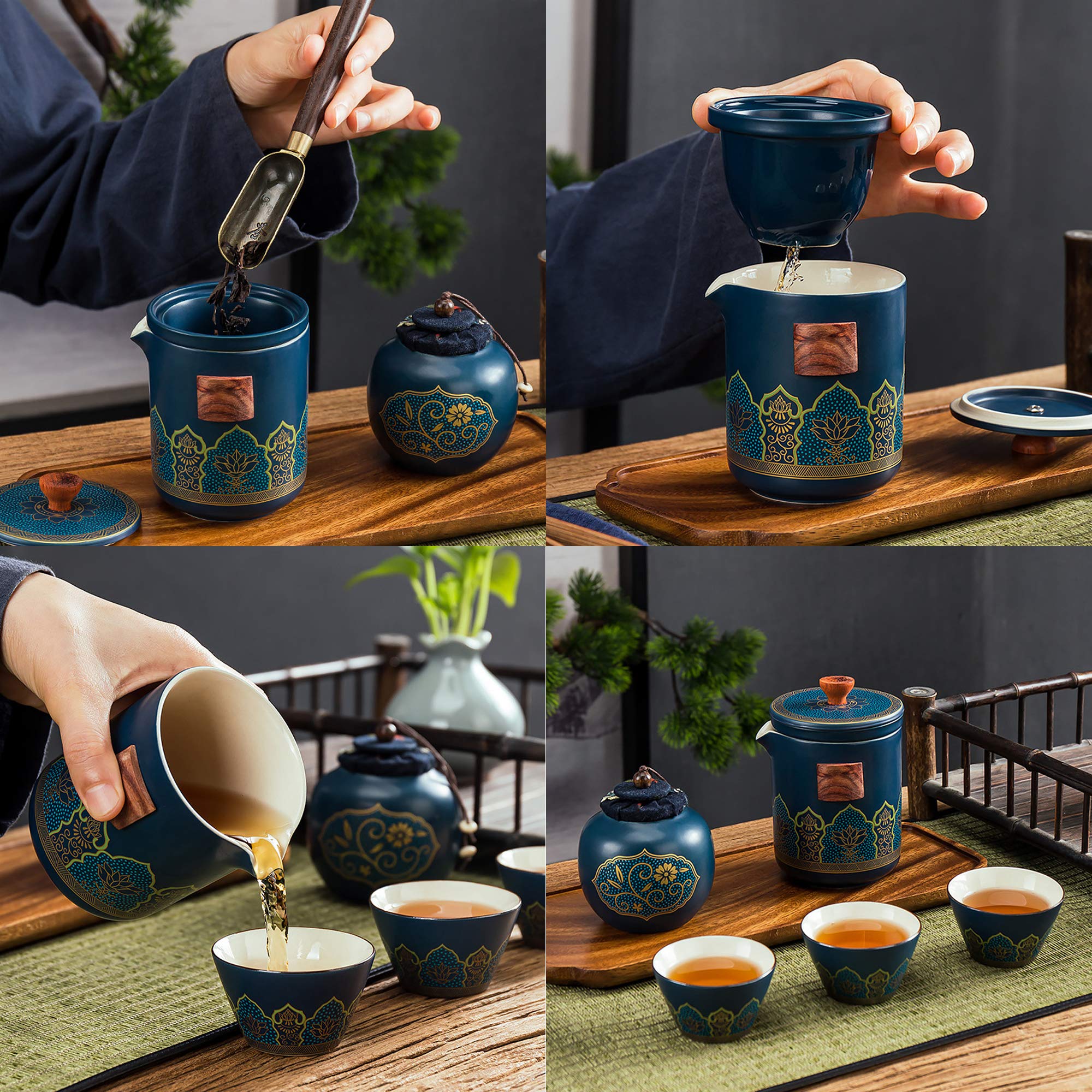 Erlebe die traditionelle chinesische Teekultur mit diesem wunderschönen tragbaren Teeset! Enthalten sind eine 180 ml Teekanne aus Porzellan mit Sieb, ein 200 ml Teedose mit praktischem Dosier-Mechanismus, ein 125 ml Fairness-Becher, sechs 45 ml Teetassen, ein Teesieb, ein Tee-Clip, ein Geschirrtuch, ein Bambus-Teetablett und eine elegante graue Reisetasche. Das Schwarz-Blaue Farbverlaufsdesign ist ein echter Hingucker. Ideal für unterwegs oder zu Hause. Ein perfektes Geschenk für Teeliebhaber und alle, die Ruhe und Entspannung suchen. Pflegeleicht und stylisch!