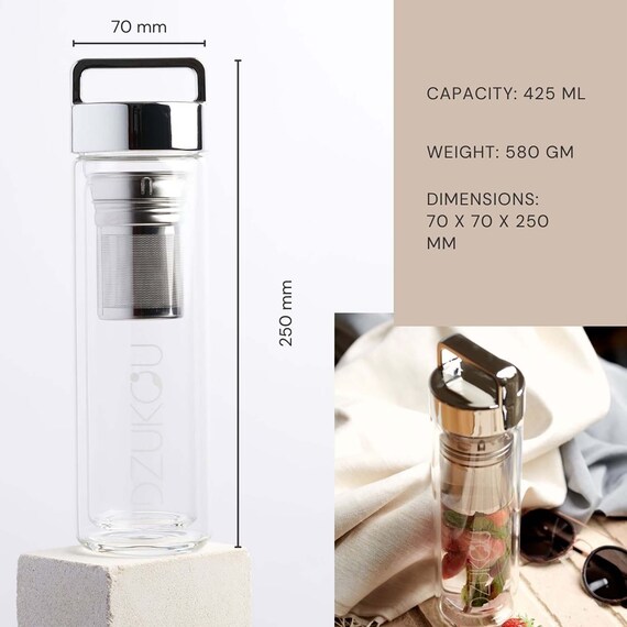 Das integrierte Edelstahl-Teesieb (304er Qualität) filtert zuverlässig Teeblätter heraus - ideal für losen Tee oder Cold Brew. Der auslaufsichere Deckel mit praktischem Tragegriff macht sie absolut alltagstauglich.