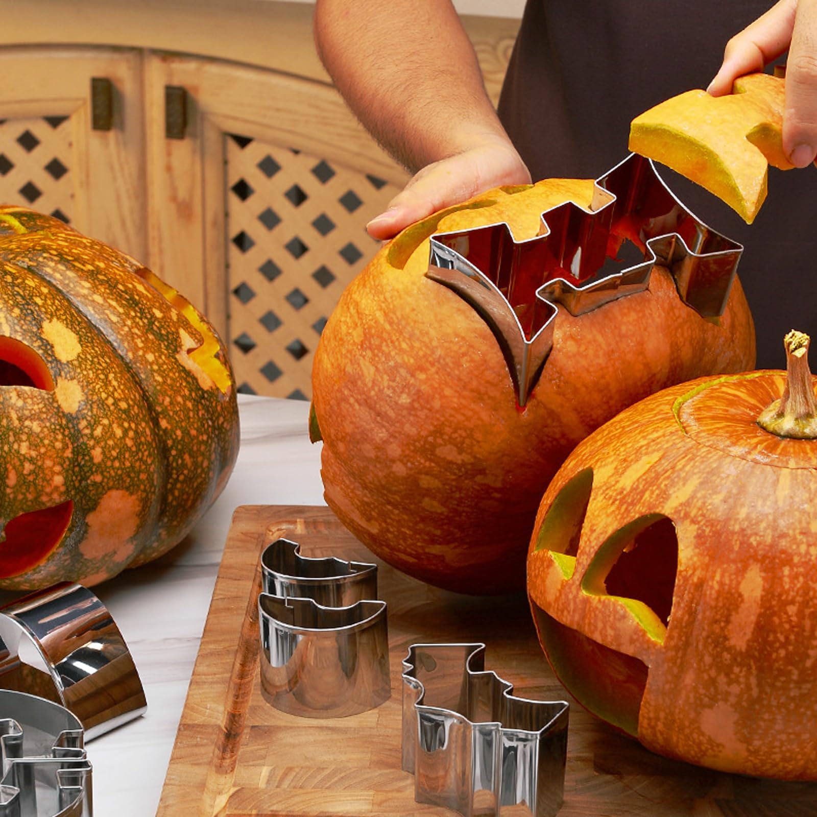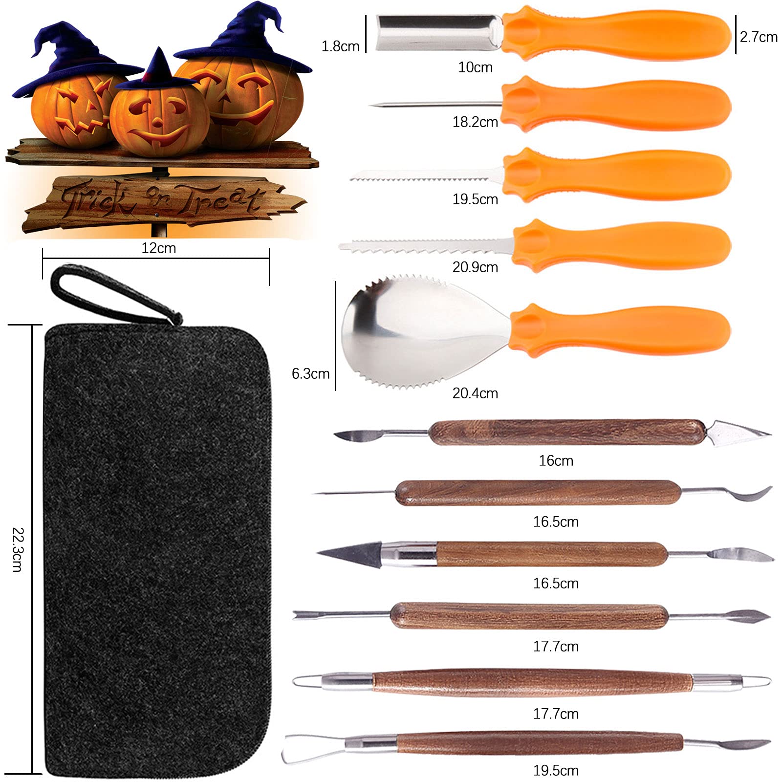 Perfekt für die Halloween-Zeit! Dieses komplette Kürbis-Schnitzset enthält alles, was du für gruselige oder lustige Kürbisgesichter brauchst. Mit 6 Edelstahl-Werkzeugen inklusive Sägen, Schnitzern und Bohrern lassen sich auch harte Kürbisse leicht bearbeiten. Das Beste: 10 verschiedene Vorlagen zeigen dir Schritt für Schritt, wie du deinen Kürbis in ein kleines Kunstwerk verwandelst. Die Werkzeuge sind super stabil und rosten nicht - halten also viele Halloween-Saisons. Nach getaner Arbeit verstaut ihr alles ordentlich in der praktischen Tragetasche. Ob für Kindergeburtstage, Partys oder gemütliche Abende zu Hause - mit diesem Set wird jedes Halloween ein voller Erfolg! Die Werkzeuge eignen sich sowohl für einfache Motive als auch für anspruchsvolle 3D-Schnitzereien. So wird deine Kürbislaterne zum absoluten Hingucker in der Nachbarschaft!