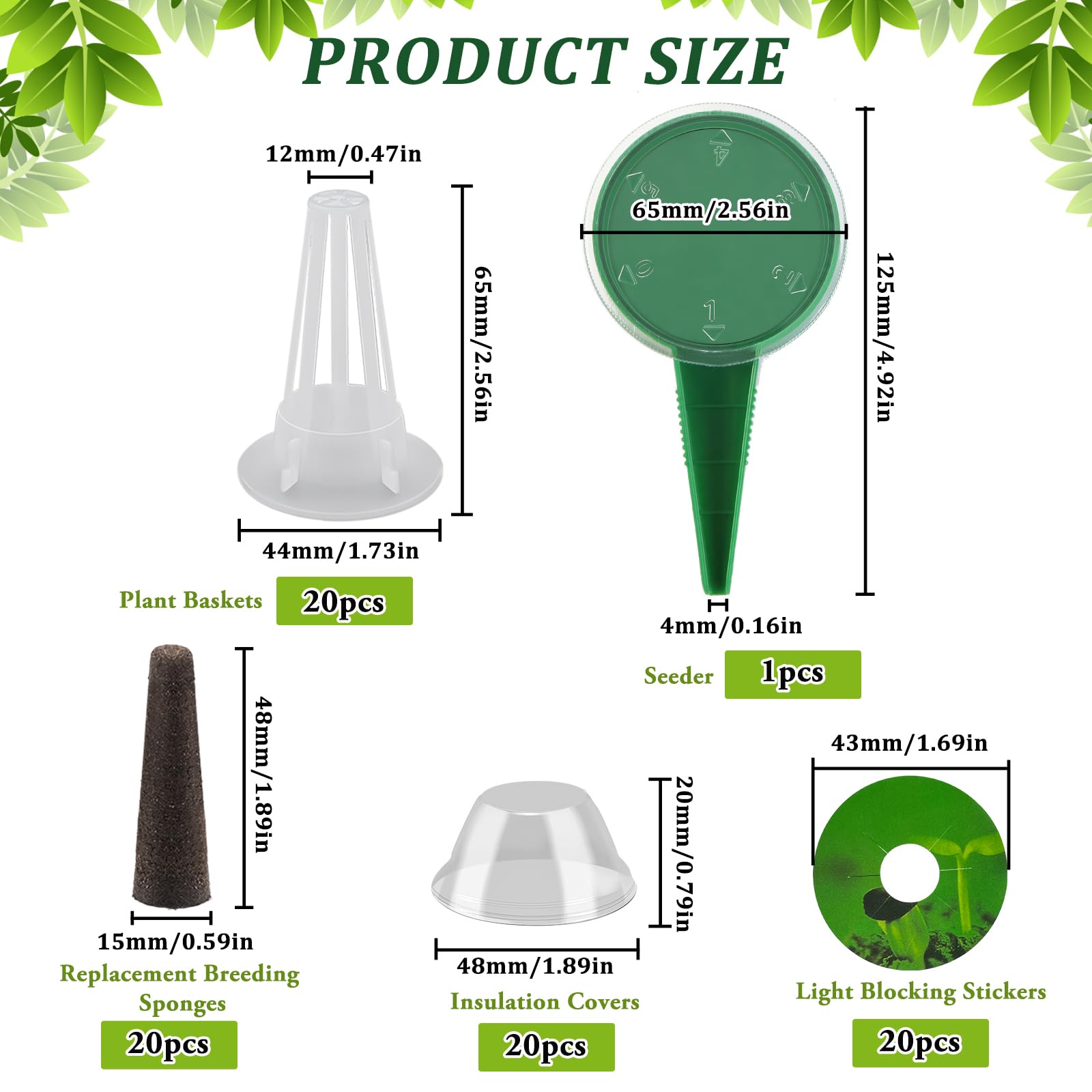 Was ist alles drin? ✔ 20x Ersatz-Zuchtschwämme aus Sphagnum-Torf ✔ 20x Pflanzkörbe aus robustem Kunststoff ✔ 20x Lichtschutzaufkleber ✔ 20x isolierende Deckel ✔ 1x praktische Sämaschine