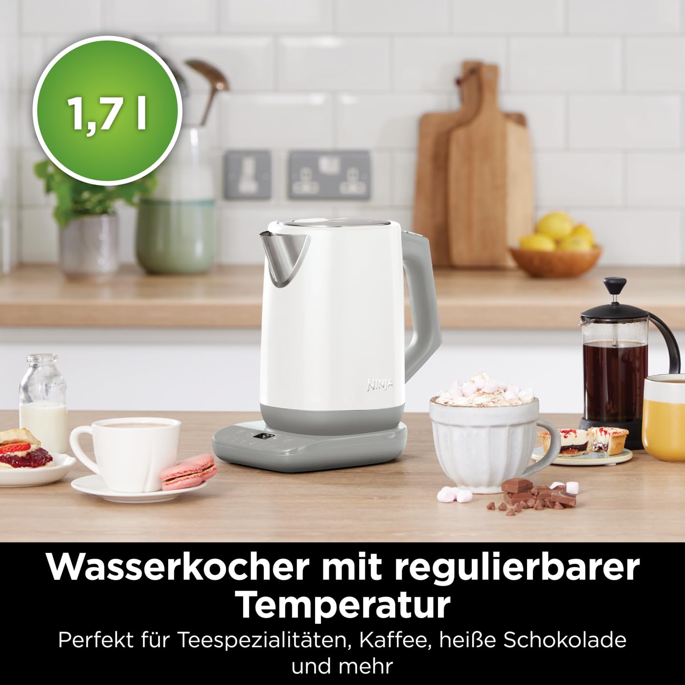 Der Ninja Perfect Temperature Wasserkocher bringt Perfektion in jede Tasse! Mit 1,7 Liter Fassungsvermögen und 3000 Watt Leistung kocht er eine Tasse Wasser in weniger als 50 Sekunden - schneller geht's kaum. Das Besondere: 6 voreingestellte Temperaturstufen von 60°C bis 100°C plus manuelle Steuerung von 40°C bis 100°C. So findest du für jedes Getränk die ideale Temperatur - ob grüner Tee, schwarzer Tee, Kaffee oder French Press. Die Hold Temp Funktion hält die gewählte Temperatur bis zu 30 Minuten lang, perfekt für mehrere Tassen hintereinander. Das praktische blaue Wasserfenster zeigt dir immer den Füllstand an. In edlem Stonegold gehalten, macht er auch optisch was her. Mit den Abmessungen 24cm x 19cm x 20,5cm und 1,24kg Gewicht findet er in jeder Küche Platz. Im Lieferumfang ist ein digitales Rezeptbuch mit Grundrezepten und Getränke-Ideen enthalten. Ob für morgendlichen Kaffee, nachmittäglichen Tee oder spezielle Heißgetränke - dieser Wasserkocher macht alles möglich. Einfach Füllstand wählen, Temperatur einstellen und genießen!