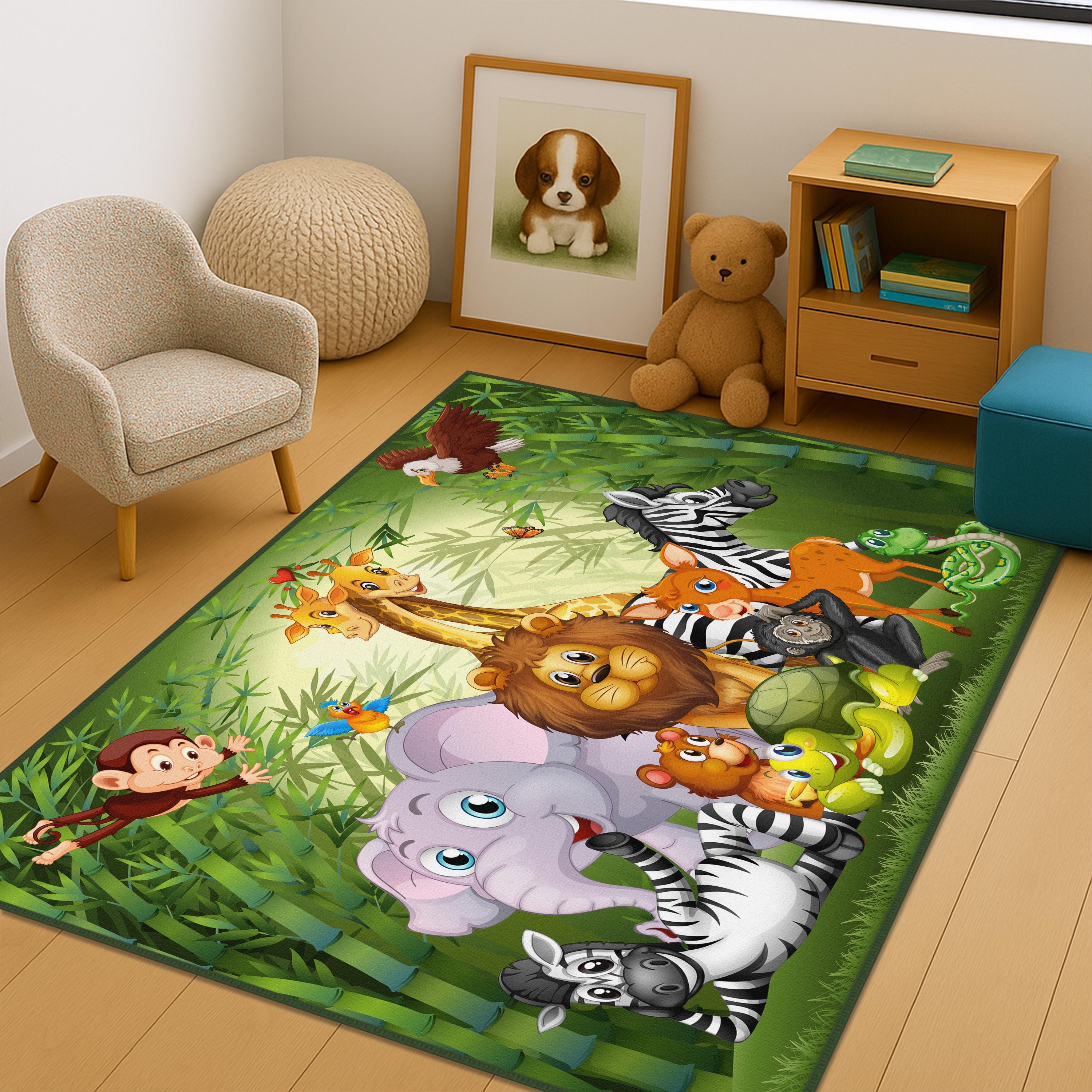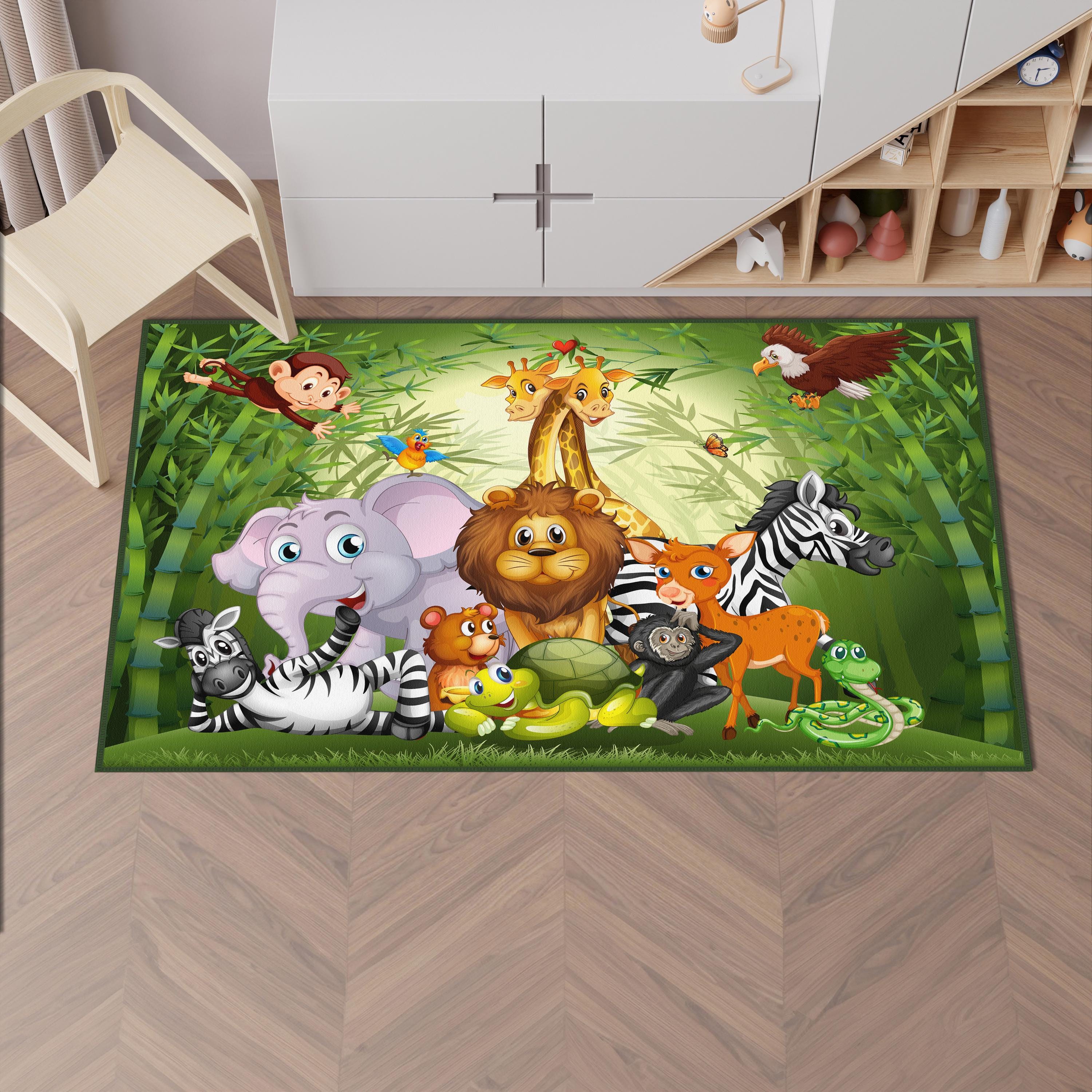 • Safari Tiere Teppich 120x170cm - Dschungel Design Kinderzimmer Teppich Waschbar Kurzflor