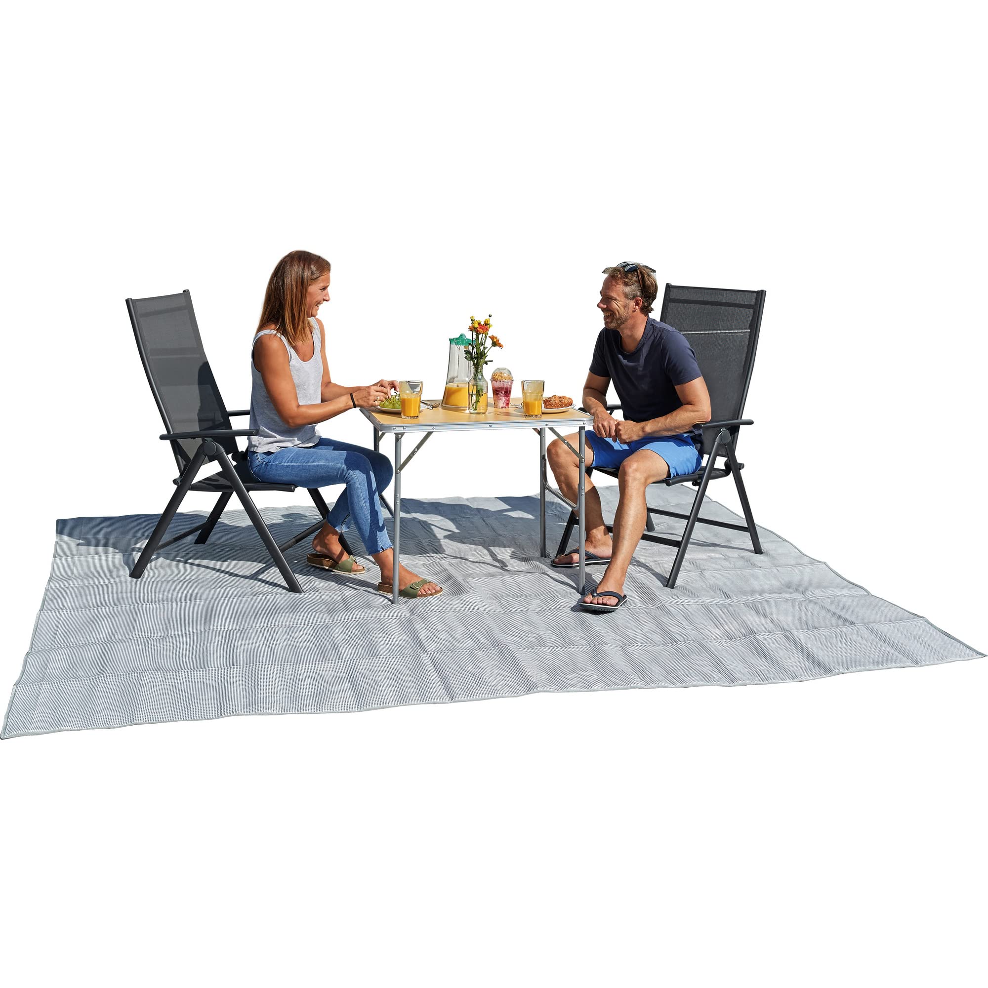 Gemütlichkeit für dein Zelt! Dieser praktische Zelt-Teppich in 250x450cm schafft eine warme und bequeme Unterlage. In dezentem Hellgrau/Grau gestreift - passt zu jedem Zelt. Aus robustem Polypropylen mit 200g/m² Flächengewicht. Leicht zu reinigen und schnell trocknend. Schützt vor Kälte und Feuchtigkeit vom Boden. Rutschgefahr beachten - nicht für nasse Bereiche geeignet. Nicht in Bereichen mit offener Flamme verwenden. Ideal für Camping, Festivals, Garten oder Balkon. Mach dein Zelt zum gemütlichen Zuhause auf Reisen! Einfach ausrollen und wohlfühlen. Perfekter Begleiter für alle Outdoor-Abenteuer!