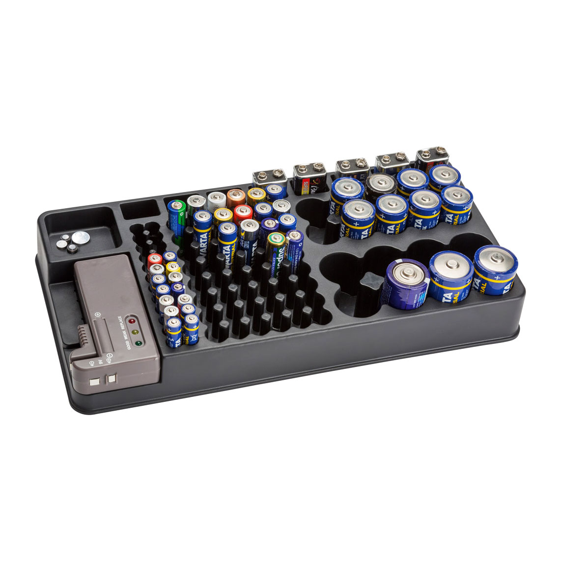Endlich Ordnung im Batterie-Chaos! Diese praktische Batteriebox von Tomedeks bietet Platz für 12 AA-Batterien und 12 Knopfzellen - alles sicher und organisiert an einem Platz. Das geniale Feature: Ein integrierter Batterietester zeigt dir an, welche Batterien noch voll und welche leer sind! Kein lästiges Ausprobieren mehr. Aus hochwertigem, wasserdichtem Material schützt sie deine Batterien vor Feuchtigkeit und Beschädigungen. Kompakt und leicht - passt perfekt in Rucksäcke, Schultaschen oder Reisegepäck. Ideal für Familien mit vielen batteriebetriebenen Geräten, Camper, oder alle, die häufig Taschenlampen und Spielzeug benutzen. Mit dieser Box hast du immer den Überblick über deine Batterien und vermeidest böse Überraschungen bei leeren Geräten. Einfach Batterien rein, Deckel zu - und schon ist alles sicher verstaut. Ein echter Lebensretter für alle Batterie-Nutzer!