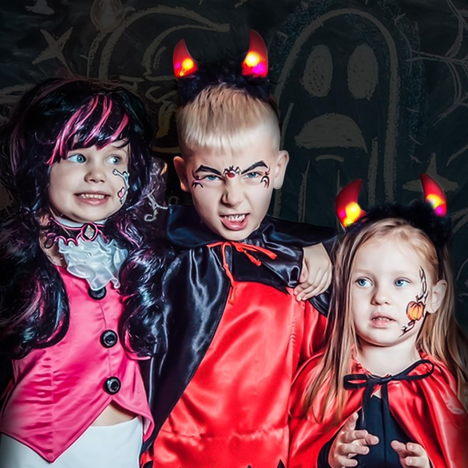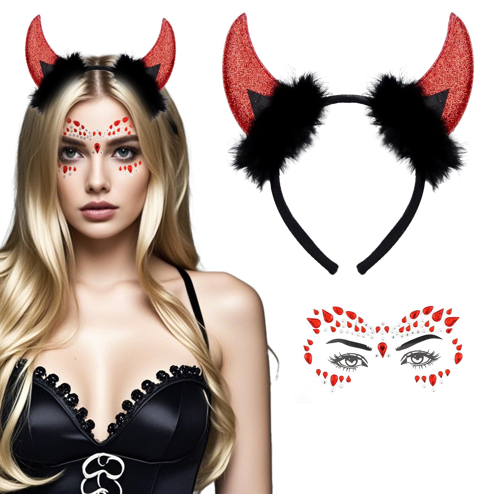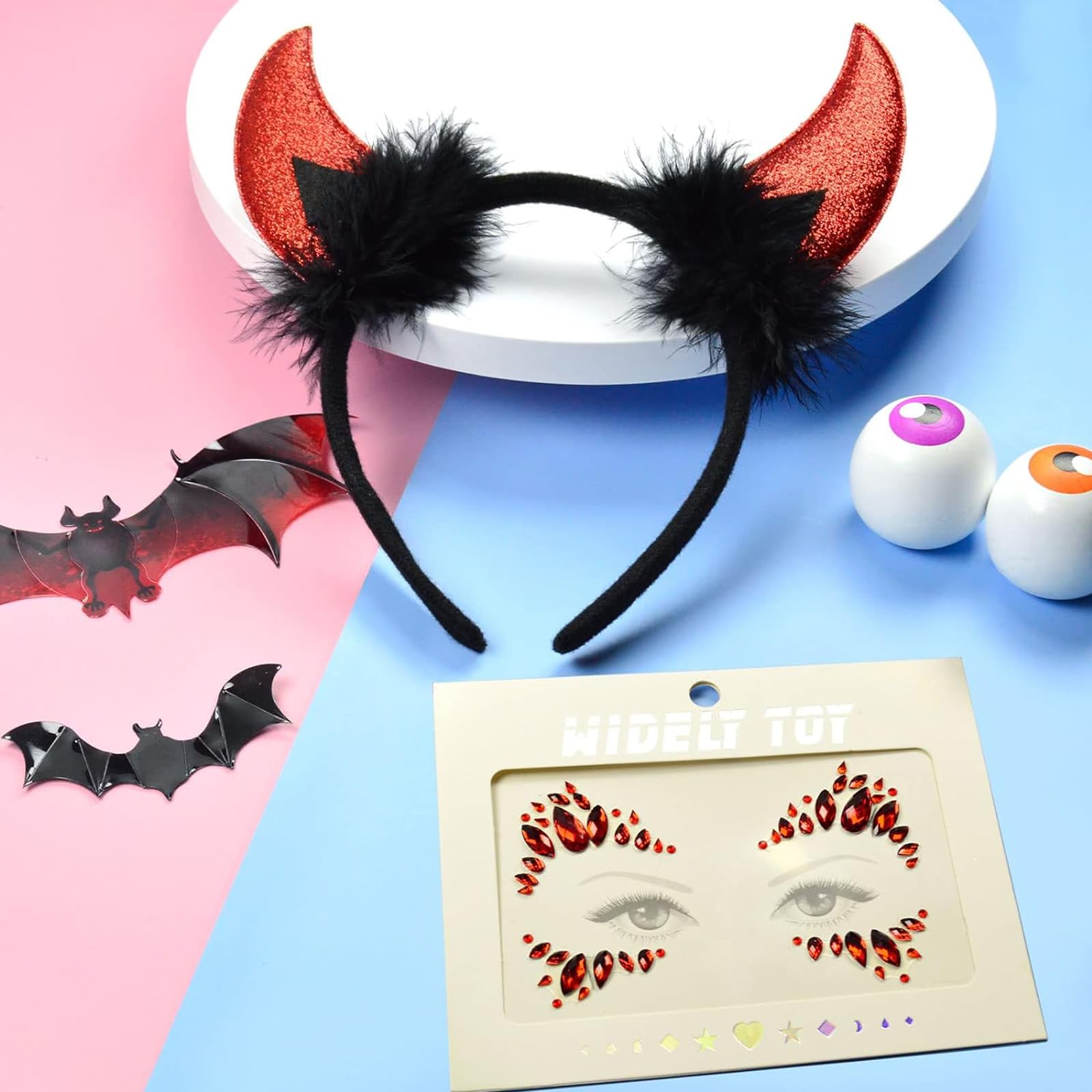 Grusel-Spaß garantiert! Dieses Teufelshörner-Set enthält 1 rotes Dämonen-Horn-Haarband mit schwarzen Federn und 2 glitzernde Gesichtstattoos. Perfekt für Halloween, Karneval oder Cosplay-Partys. Das elastische Haarband passt Erwachsenen und Kindern. Die glitzernden Steine haften sicher auf der Haut. Einfach zu tragen und wiederverwendbar. Werde zum Highlight auf jeder Party mit diesem auffälligen Deko-Set!