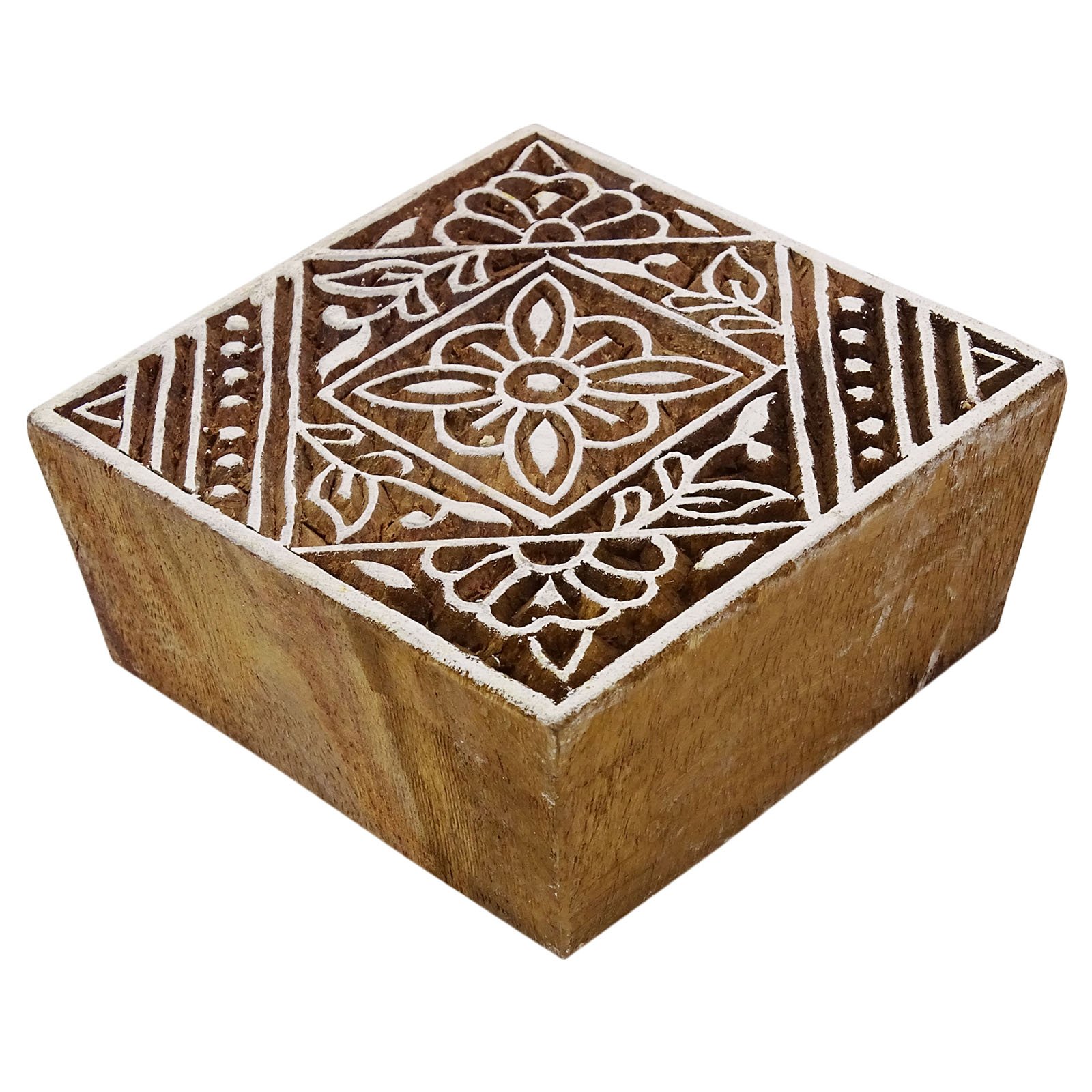 Wow, dieser handgeschnitzte Holzstempel aus Indien ist einfach ein Traum für alle Bastelfans! Mit seinem wunderschönen Blumenmuster kannst du damit ganz easy Stoffe, Tapeten oder Papier bedrucken und deinen eigenen individuellen Look kreieren. Jeder Stempel ist ein Unikat - liebevoll von indischen Handwerkern gefertigt, sodass sich jedes Stück leicht in Größe und Form unterscheidet. Mit ca. 2x2 Zoll (etwa 5x5 cm) ist er perfekt für alle möglichen DIY-Projekte. Ob für Kissenbezüge, Taschen, Geschenkpapier oder Wanddekoration - deiner Kreativität sind keine Grenzen gesetzt! Das Beste: Du kannst sogar eigene Designs anfertigen lassen. Mit nur 50 Gramm ist der Stempel super handlich und liegt gut in der Hand. Einfach Farbe auftragen, aufdrücken und schon hast du ein professionell aussehendes Muster! Perfekt für alle, die gerne basteln, scrapbooken oder ihren Textilien einen persönlichen Touch verleihen wollen. Einfach mal ausprobieren - damit wird jedes Projekt zum echten Hingucker!