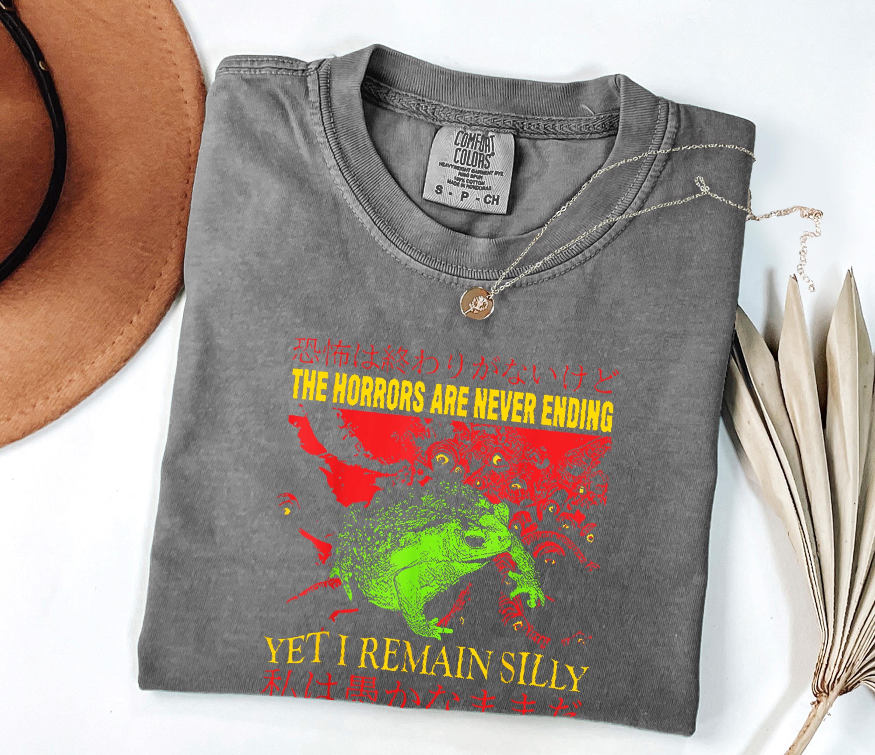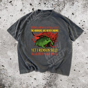 Cosmic Frog meets existential humor! Dieses coole Tank Top zeigt einen Frosch vor kosmischem Horror-Hintergrund - mit englischem und japanischem Text. Perfekt für Fans von dunklem Humor, alternativer Kunst und surrealen Designs. Leichtes Material, doppelt genähte Säume für langanhaltenden Tragekomfort. Ideal für Alltag, Halloween oder Conventions. Zeig der Welt, dass du trotz aller Horrors immer noch silly bleibst!