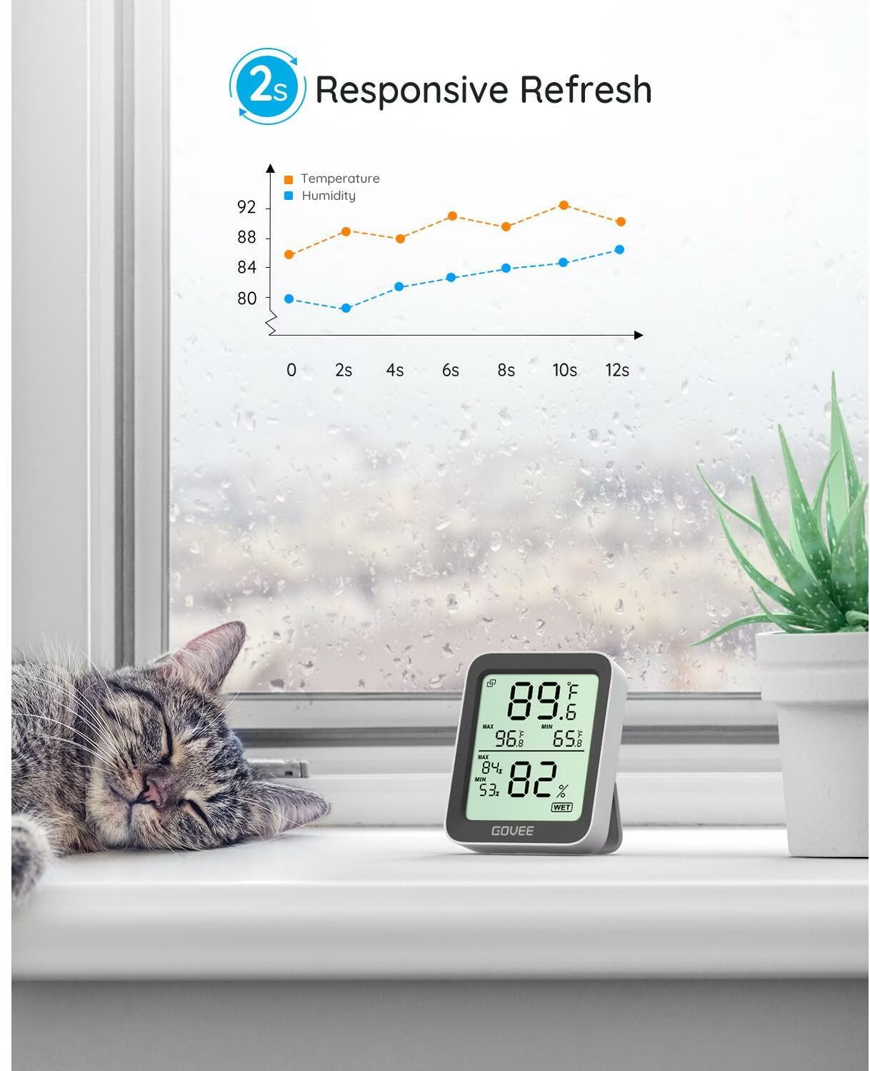 Immer die perfekte Raumluft im Blick! Das Govee Thermometer misst Temperatur (±0,3°C genau) und Luftfeuchtigkeit (±3%) mit Schweizer Sensortechnologie. Großes 3-Zoll LCD Display zeigt alle Daten klar an. Per Bluetooth bis 60m Reichweite mit deinem Smartphone verbinden - App-Benachrichtigungen bei Grenzwert-Überschreitungen. Speichert 20 Tage Datenverlauf, exportierbar als CSV. Ideal für Gewächshaus, Weinkeller, Babyzimmer oder Büro. Endlich volle Kontrolle über dein Raumklima - smart, präzise und zuverlässig!