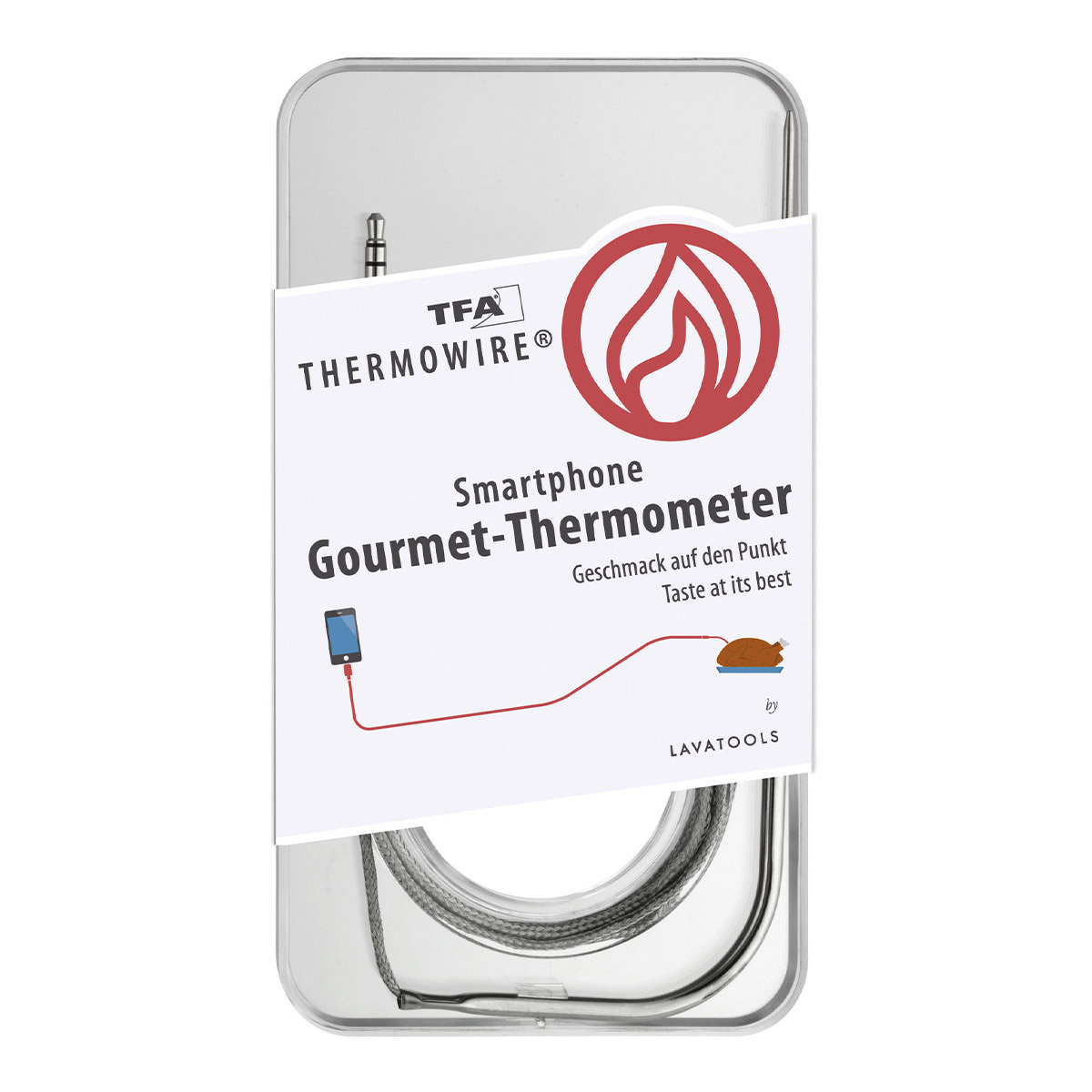Nie wieder trockenes Fleisch! Mit dem Thermowire Gourmet-Thermometer von TFA Dostmann gelingen dir Steaks, Braten und Geflügel immer perfekt. Einfach den Edelstahl-Fühler in die Kopfhörerbuchse deines Smartphones stecken, die kostenlose App runterladen und schon kann's losgehen. Das Thermometer misst super präzise von -40°C bis 250°C und warnt dich, wenn die gewünschte Kerntemperatur erreicht ist. In der App findest du 13 vorprogrammierte Profile für verschiedene Fleischsorten und Garstufen, oder du erstellst einfach deine eigenen Einstellungen. Das 1 Meter lange Kabel ist hitzebeständig und das Gerät braucht keine extra Batterien. Mit Timer-Funktion, grafischer Anzeige des Garfortschritts und sogar Foto-Sharing für deine kulinarischen Meisterwerke. So kochst du wie ein Profi - ganz easy!