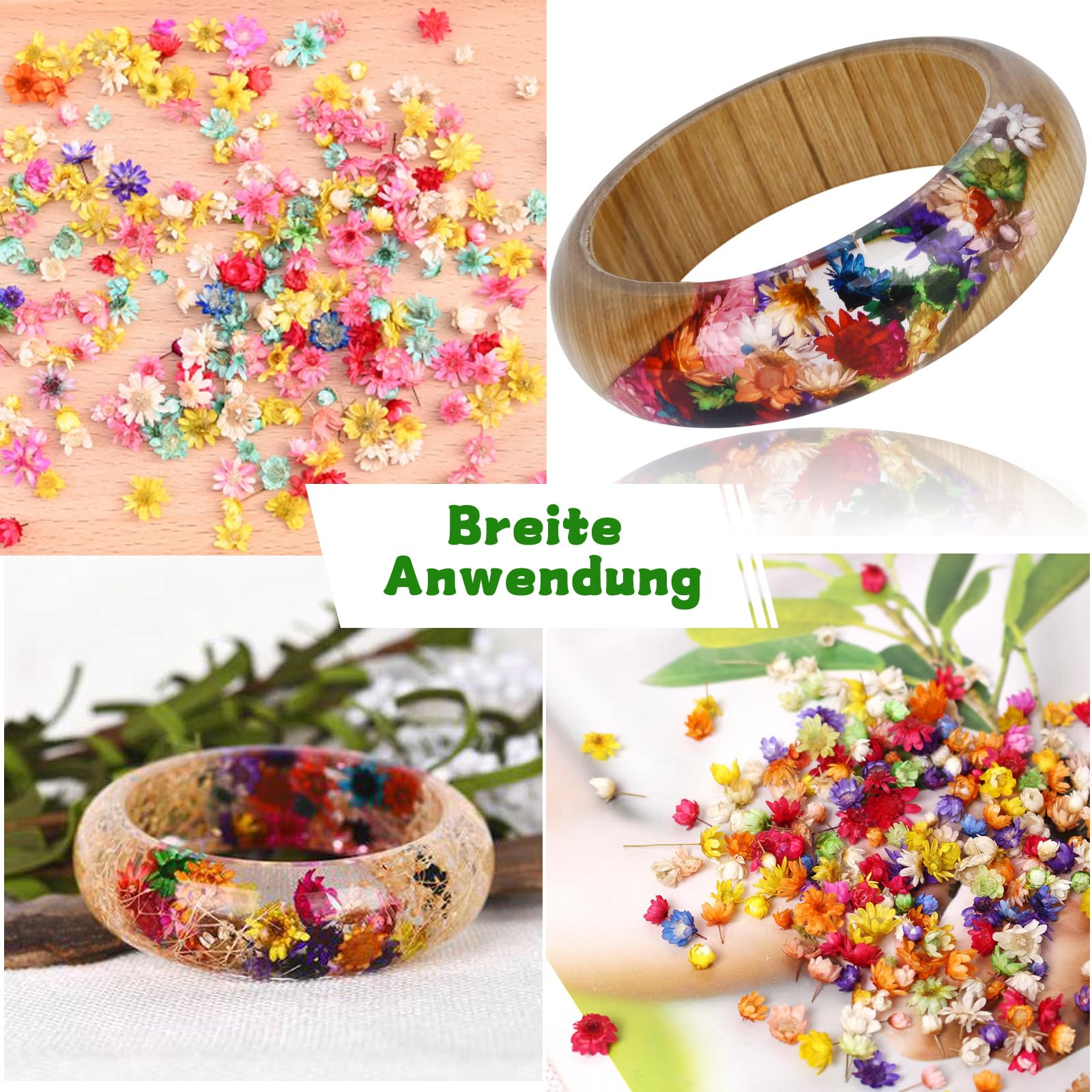 Wow, 200 natürliche Mini-Trockenblumen in einem Set! Perfekt für alle, die gerne basteln und ihre Projekte mit echten getrockneten Blüten aufpeppen wollen. Diese kleinen Sternblumen und Mini-Gänseblümchen sind total vielseitig - ob für selbstgemachten Schmuck, individuelle Kerzen, hübsche Karten oder coole Resin-Ornamente. Macht einfach Spaß! Die Blüten sind aus 100% natürlichem Material, schonend getrocknet und behalten so ihre ursprüngliche Farbe und den zarten Duft. Und das Beste: Sie sind absolut ungiftig und umweltfreundlich. Einfach an der gewünschten Stelle ankleben und schon wird's hübsch! Kein Gießen, kein Schnippeln - diese Trockenblumen halten ewig und machen nie schlapp. Ideal für DIY-Anfänger und Profis gleichermaßen. Ob für Duftkerzen, Driftflaschen oder andere Deko-Ideen - hier findet jeder sein Lieblingsprojekt. Mit 120g Inhalt und 200 einzelnen Blütenköpfen hast du genug Material für mehrere Bastelabende. Einfach super für alle, die kreativ werden wollen!