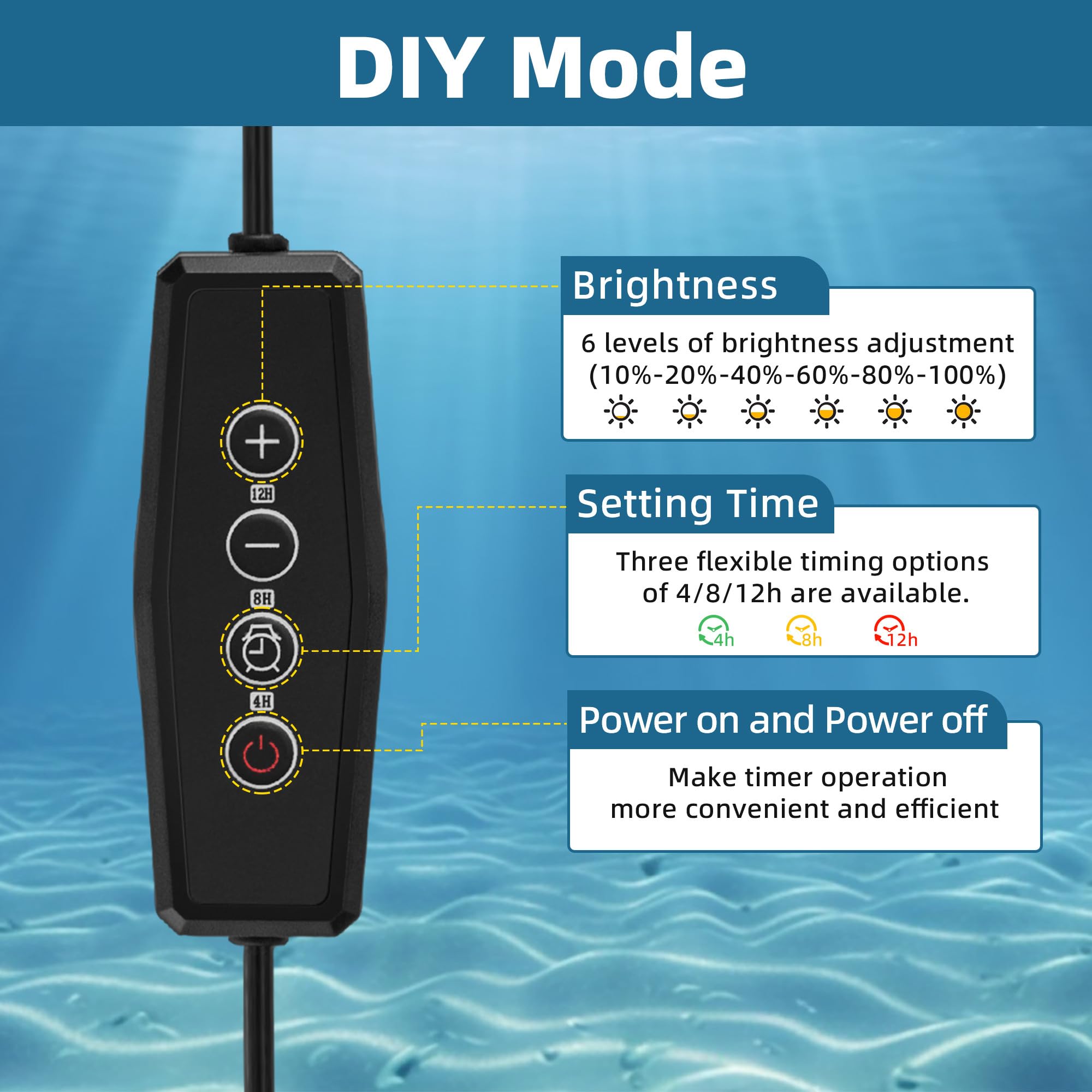 Mehrere Dimm-Stufen geben dir totale Kontrolle über die Helligkeit. So kannst du für jede Tageszeit die perfekte Stimmung schaffen. Dein Aquarium wird zum echten Hingucker!