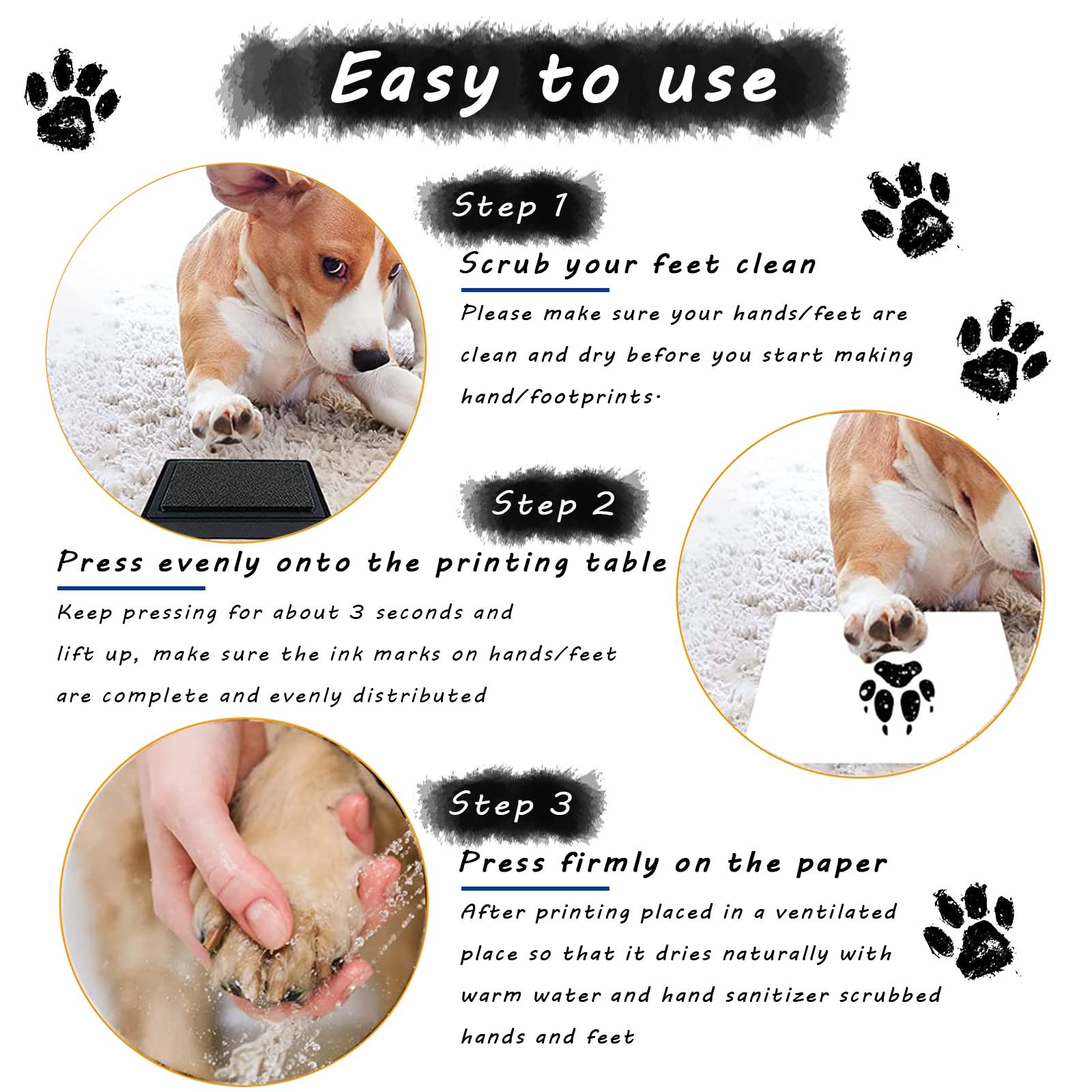 Tierbesitzer, dieses Pfotenabdruck-Stempelkissen ist die perfekte Art, Erinnerungen an eure Lieblinge festzuhalten! Mit sicherer, haustierfreundlicher schwarzer Tinte - kein Chaos und ungefährlich für eure Vierbeiner. Einfach die Pfoten vorsichtig auf das Kissen drücken, dann auf Papier oder in ein Erinnerungsalbum stempeln. Die Pfoten danach einfach abwaschen - fertig! Mit 9,3x6,5x2,2 cm kompakt und handlich. Perfekt um die Kindheit eures Haustiers zu dokumentieren oder bleibende Erinnerungen zu schaffen. Aus umweltfreundlichem Material - ihr könnt es bedenkenlos verwenden. Ein wunderschönes Andenken, das ihr für immer behalten werdet. Einfach anwenden und sich über die niedlichen Pfotenabdrücke freuen!