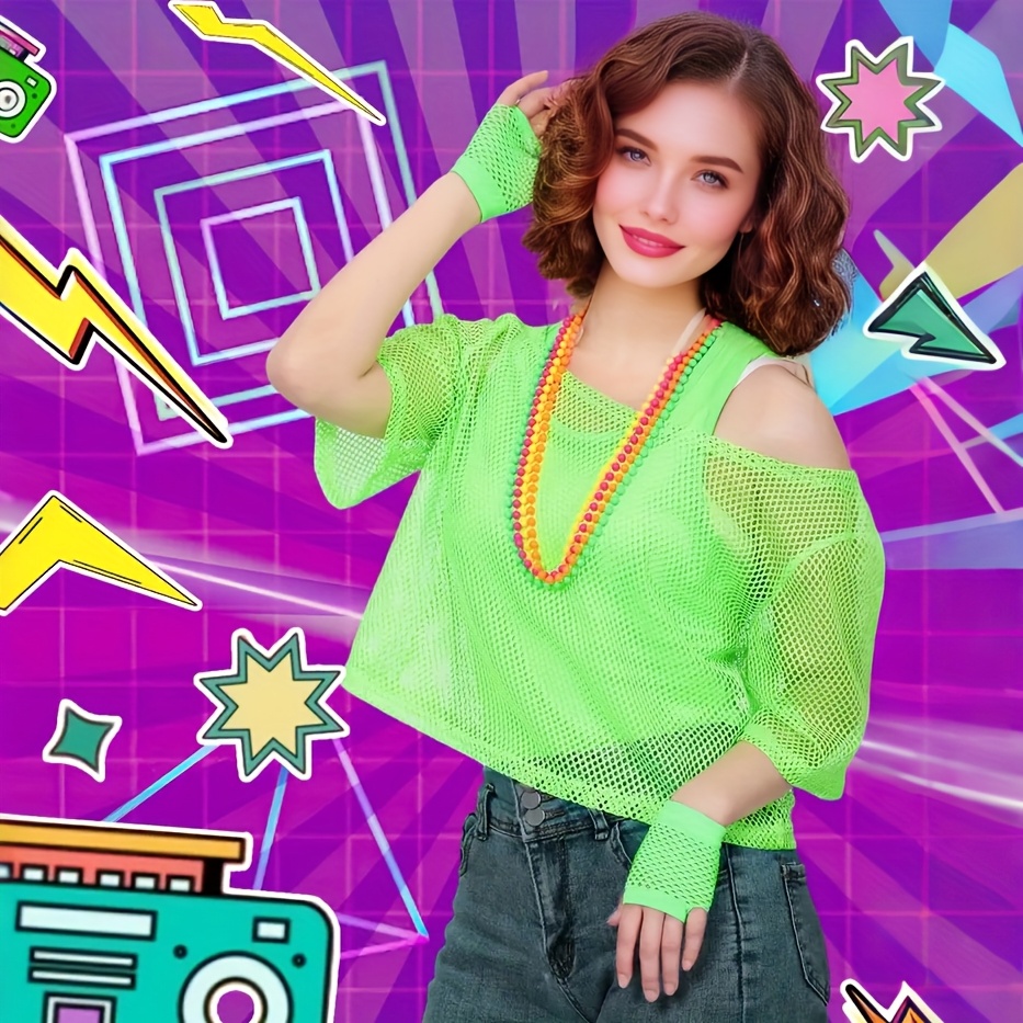Damen Netz-Kurzarm-Top 80er Style - Neon Festival Shirt Für Retro Partys