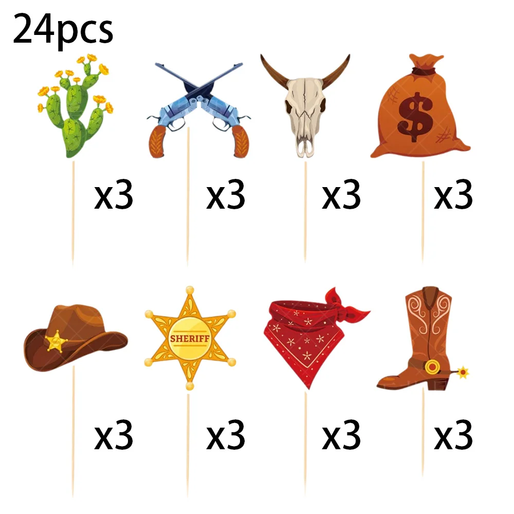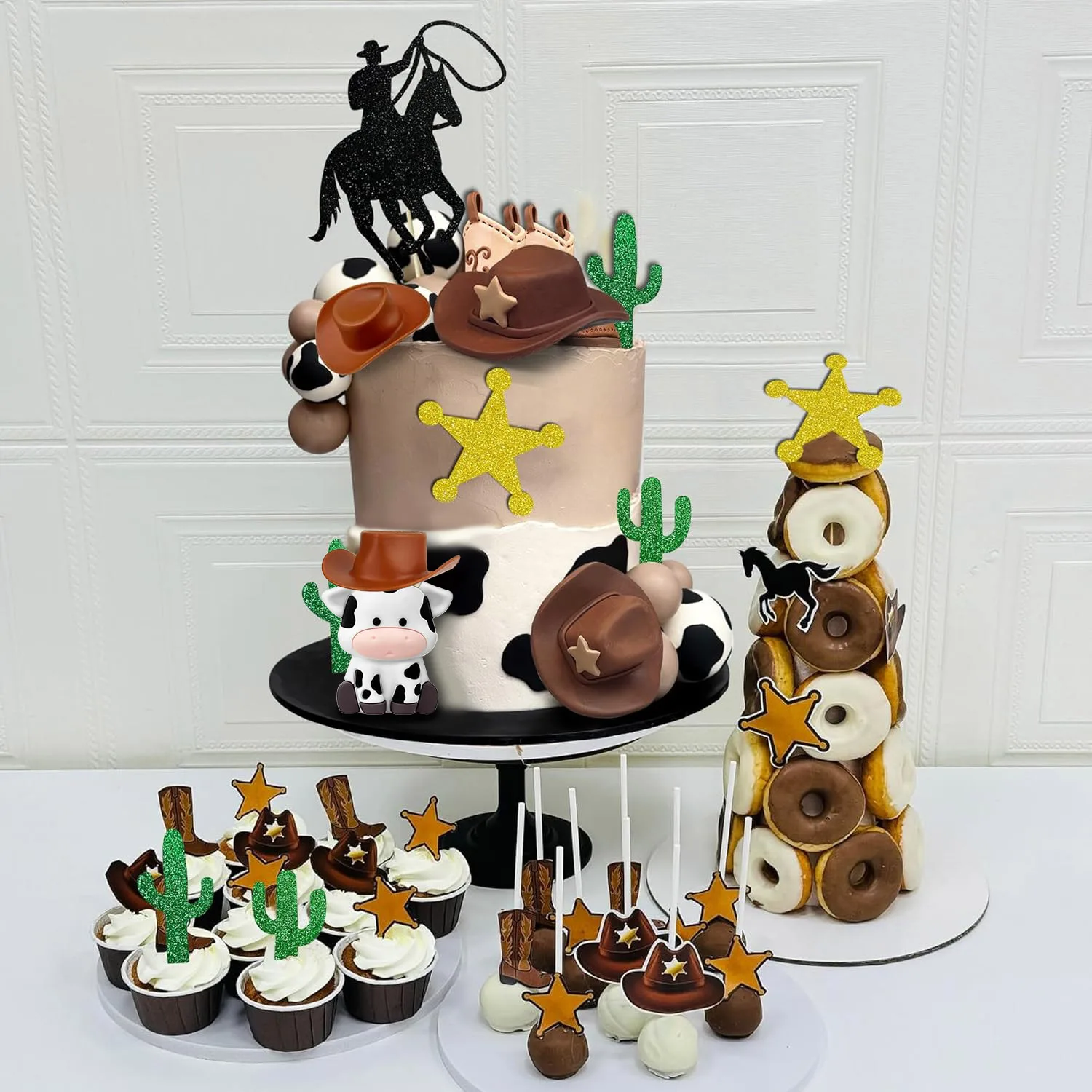 Howdy ihr Party-Planer! Dieser Lukinuo Cowboy Kuchen-Topper verwandelt eure Torte in ein wildes Western-Abenteuer! Im Set sind 24 Teile enthalten: Cowboy-Hüte, Stiefel, Sterne, Kugeln mit Kuh-Print und Hufeisen - alles für die perfekte Rodeo-Party.