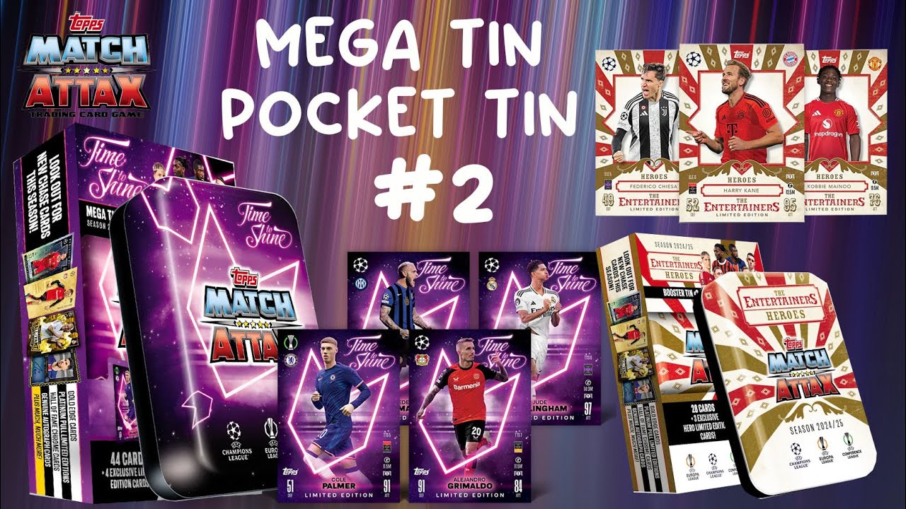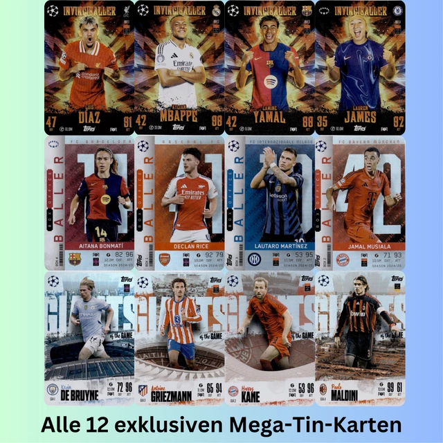 Für alle echten Sammler! Dieses exklusive Mega Tin Bundle enthält alle 4 'Time to Shine' Mega Tins der aktuellen Match Attax Saison 24/25. Jede Dose beinhaltet 44 Match Attax-Karten plus VIER limitierte Karten von Top-Spielern wie Bukayo Saka, Jude Bellingham, Erling Haaland und Trent Alexander-Arnold. Das Besondere: In glücklichen Dosen findest du sogar spezielle Relic oder Jersey Worn Karten! Offizielles UEFA-Lizenzprodukt mit allen großen Stars. Perfekt zum Tauschen, Spielen oder einfach nur Sammeln. Ob als Geschenk für junge Fußballfans oder für erfahrene Sammler - dieses Bundle ist ein absolutes Must-have. Schnell zugreifen, denn solche limitierten Sets sind schnell vergriffen!