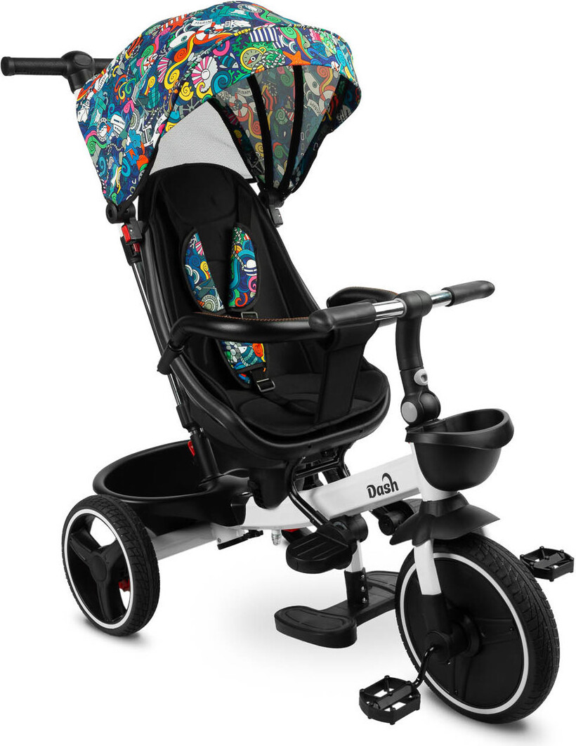 Das erste eigene Fahrzeug für dein Kind! Dieses süße Dreirad wächst mit: Mit Schubstange und Sicherheitsgurt für die Kleinen, später selbst fahren. Der Sitz ist drehbar - Kind kann vorwärts oder rückwärts gucken. Verdeck schützt vor Sonne, die Körbe bieten Stauraum. Für Kinder von 1-5 Jahren, bis 25 kg. Klappbar für platzsparende Aufbewahrung. Macht jedem Kind eine Freude!