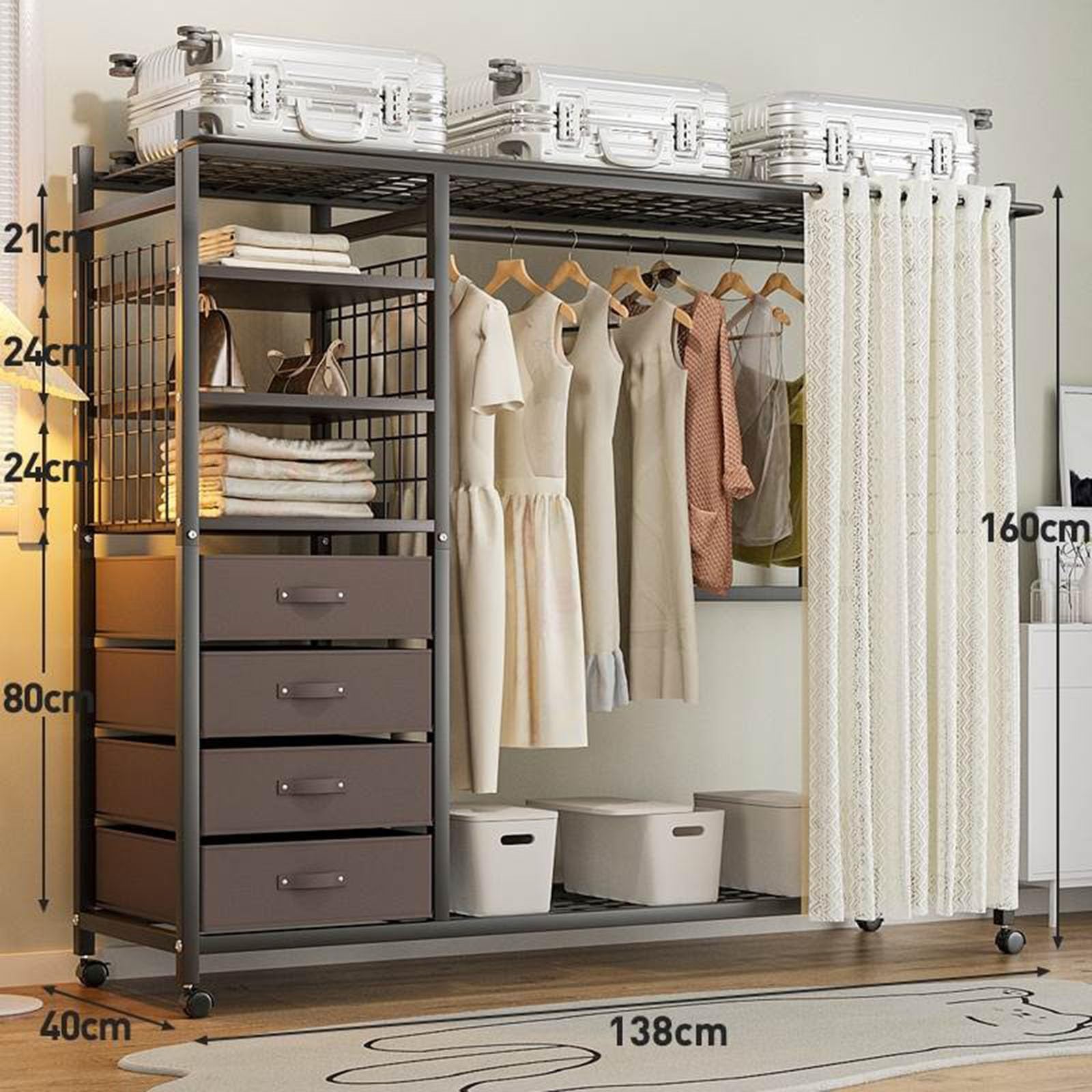Dieser tragbare Kleiderschrank ist die Rettung für kleine Wohnungen! 155cm hoch, mit 5 Fächern - da passt ne Menge rein. Aus Stahl und Vliesstoff, richtig stabil. Staubdichte Vorhänge schützen deine Kleidung. Maße: 40x28x155cm, also schlank aber geräumig. Perfekt fürs Schlafzimmer, Studentenzimmer oder WG. Einfach aufstellen und schon hast du mehr Ordnung. Hält bis zu 1800g aus - also voll beladbar. Damit wird aus Chaos ganz schnell eine aufgeräumte Wohnung. Super praktisch und sieht auch noch gut aus!