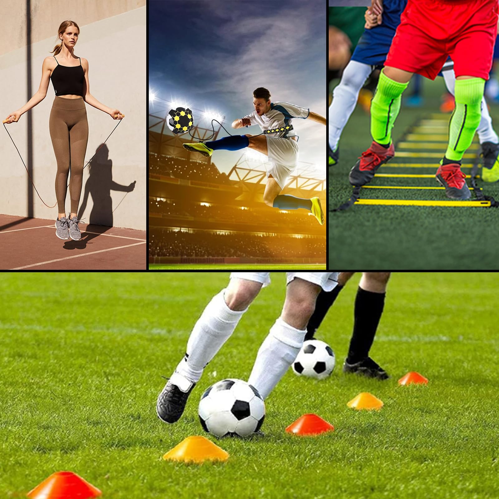Das komplette Fußball-Training für zu Hause! Dieses Set hat alles, was du für professionelles Training brauchst: Eine 8 Meter lange Koordinationsleiter mit 16 Sprossen für schnelle Beinarbeit, 16 bunte Hütchen zum Slalomlaufen und Markieren, einen Widerstandsfallschirm für Sprinttraining und 5 verschiedene Widerstandsbänder für Kraftaufbau. Alles verpackt in einer praktischen Tragetasche - ideal für Training im Park, Garten oder Verein! Die Leiter wird mit Stahlstiften am Boden befestigt - verrutscht nicht! Der Fallschirm ist verstellbar und mit Klick-Verschluss - einfach umschnallen und loslaufen! Perfekt für Fußballer, Leichtathleten, Tennis-Spieler - eigentlich für alle Sportarten, bei denen Schnelligkeit und Beweglichkeit wichtig sind. Ob für Kinder, Jugendliche oder Erwachsene - hier kann jeder sein Training verbessern! Einfach aufbauen und sofort mit dem Training starten - deine Leistung wird sich garantiert verbessern!