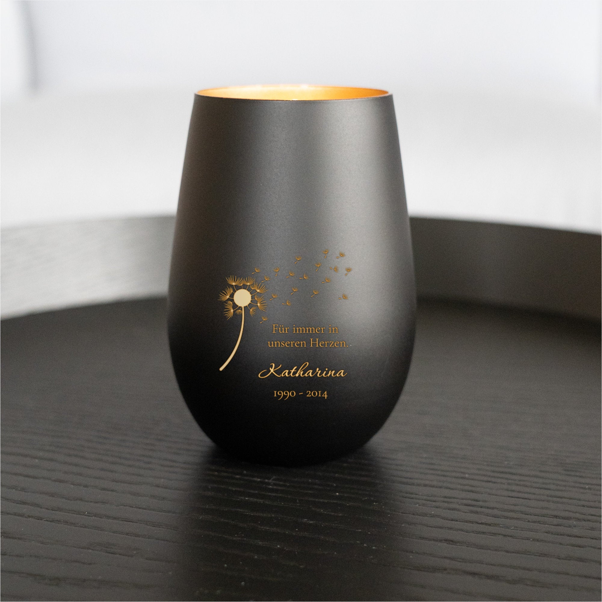 Ein stilles Andenken für besondere Menschen. Dieses Gravur-Max Windlicht spendet Trost und bewahrt Erinnerungen. Mit der persönlichen Gravur 'Für immer in meinem Herzen' und deinem Wunschname sowie Datum wird es zu etwas ganz Besonderem. Aus hochwertigem Glas, 12 cm hoch und 8,5 cm breit, mit 465 ml Fassungsvermögen für LED-Teelichter (nicht im Lieferumfang). Wählbar in verschiedenen Farbkombinationen: Außen schwarz oder weiß, innen gold, silber oder bronze. Jedes Stück wird in Deutschland mit Liebe zum Detail per Lasergravur personalisiert - ein echtes Unikat. Für eine würdevolle Atmosphäre des Gedenkens.