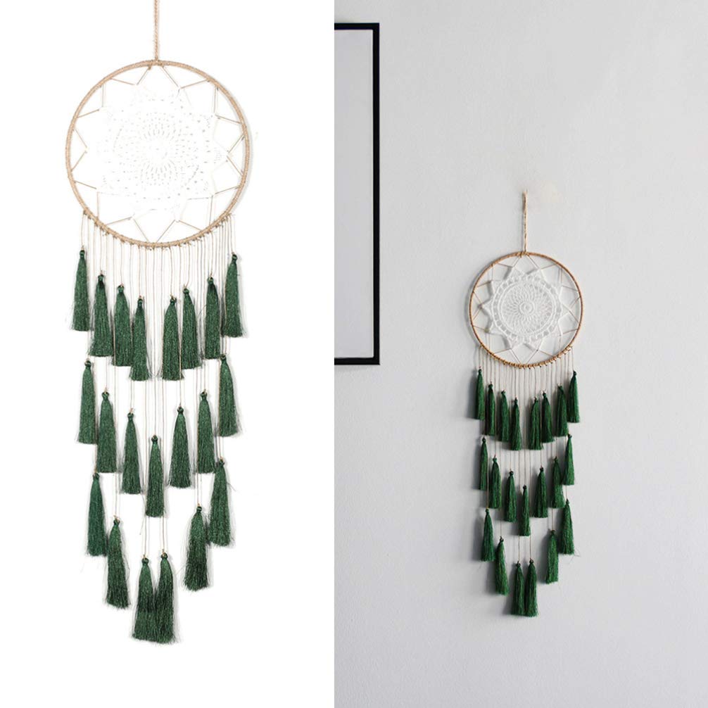 Träumst du von erholsamem Schlaf? Dieser wunderschöne handgemachte Traumfänger bringt positive Energie in dein Zuhause! Nach alter Tradition geflochten, filtert er schlechte Träume heraus und lässt nur die guten durch. Aus natürlicher Baumwolle, Holzperlen und Draht gefertigt - komplett chemiefrei und umweltfreundlich. Die eleganten weißen Quasten und das florale Muster in der Mitte sehen einfach traumhaft aus! Perfekt fürs Schlafzimmer, Wohnzimmer oder als besonderes Geschenk für liebe Menschen. Einfach aufhängen und sich an der friedvollen Atmosphäre erfreuen. Ob für dich selbst oder als Mitbringsel - dieser Traumfänger bringt Stil und positive Schwingungen in jeden Raum!