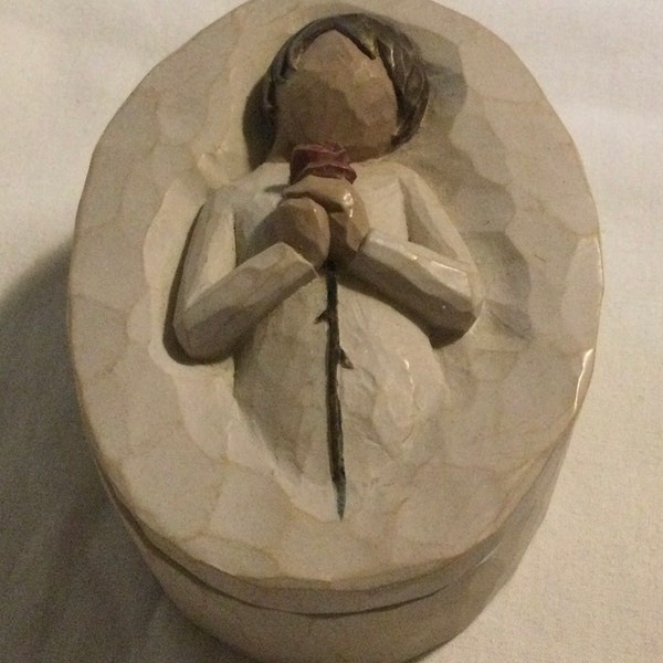 Diese bezaubernde Willow Tree Figur spricht direkt zum Herzen! Das kleine Mädchen in zarter Pose - handgefertigt und handbemalt aus hochwertigem Kunstharz. Mit 13,5cm Höhe perfekt für Regal, Nachttisch oder Schreibtisch. Geschaffen von Künstlerin Susan Lordi in ihrem Atelier in Kansas City - jedes Stück ein Unikat! Die Figur kommuniziert durch ihre Geste ohne Worte - sie drückt Liebe, Nähe und Erinnerung aus. Ideal als tröstendes Geschenk in schwierigen Zeiten oder einfach als Zeichen der Zuneigung. Sieht aus wie aus Holz geschnitzt - aber aus robustem Kunstharz. Perfekt um jemanden in Gedanken nahe zu behalten oder eine besondere Erinnerung zu bewahren. Ob für sich selbst oder als Geschenk - diese Figur berührt jedes Herz. Ein stiller Begleiter der Trost und Hoffnung spendet. Einfach hinstellen und sich an der zarten Ausstrahlung erfreuen. Willow Tree - mehr als nur Dekoration, es sind gefühlvolle Kunstwerke!