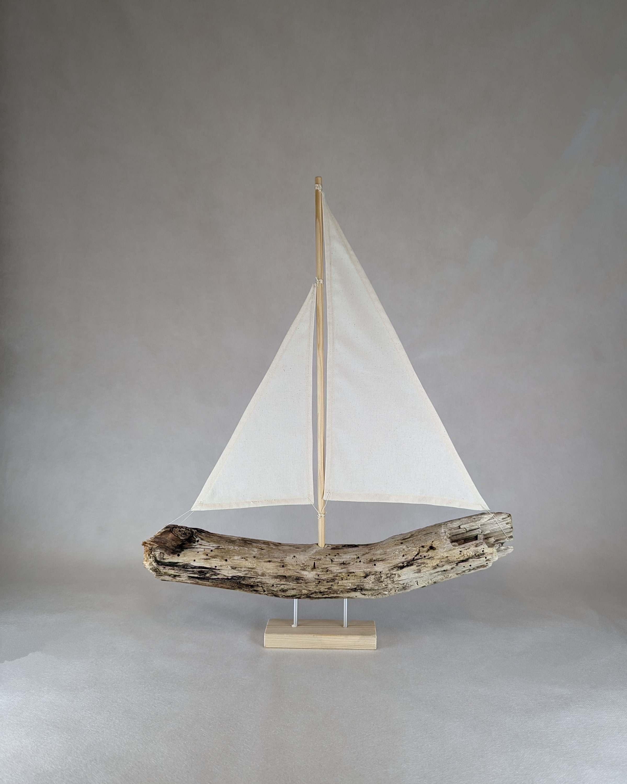 Ahoy! Dieses wunderschöne Segelboot aus echten Treibholz ist ein absoluter Hingucker für jedes Zuhause. Jedes Boot ist ein Unikat, liebevoll von Hand gefertigt aus naturbelassenen Treibholzstücken, die das Meer angespült hat. Mit ca. 40cm Höhe und 30-40cm Breite macht es auf jedem Sideboard, Regal oder Kaminsims eine tolle Figur. Die cremefarbenen Leinensegel verleihen dem Boot maritimen Charme und der stabile Holz-Fuß sorgt für sicheren Stand. Perfekt für alle, die das Meer lieben oder ihrem Zuhause eine maritime Note verleihen wollen. Ob im Wohnzimmer, Flur oder Büro - dieses Segelschiff erzählt Geschichten von stürmischer See und fernen Ländern. Ein wunderbares Geschenk für Segler, Meer-Liebhaber oder alle, die besondere Deko schätzen. Einfach hinstellen und von hoher See träumen!