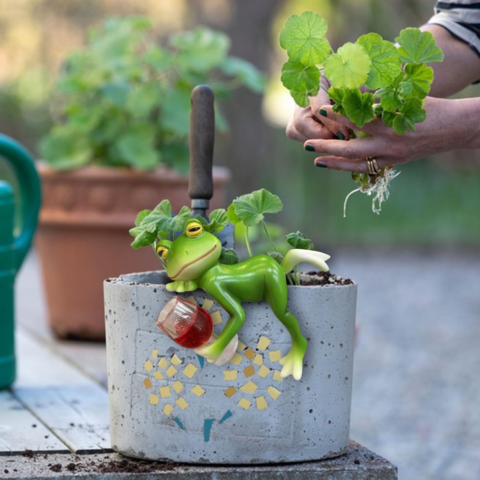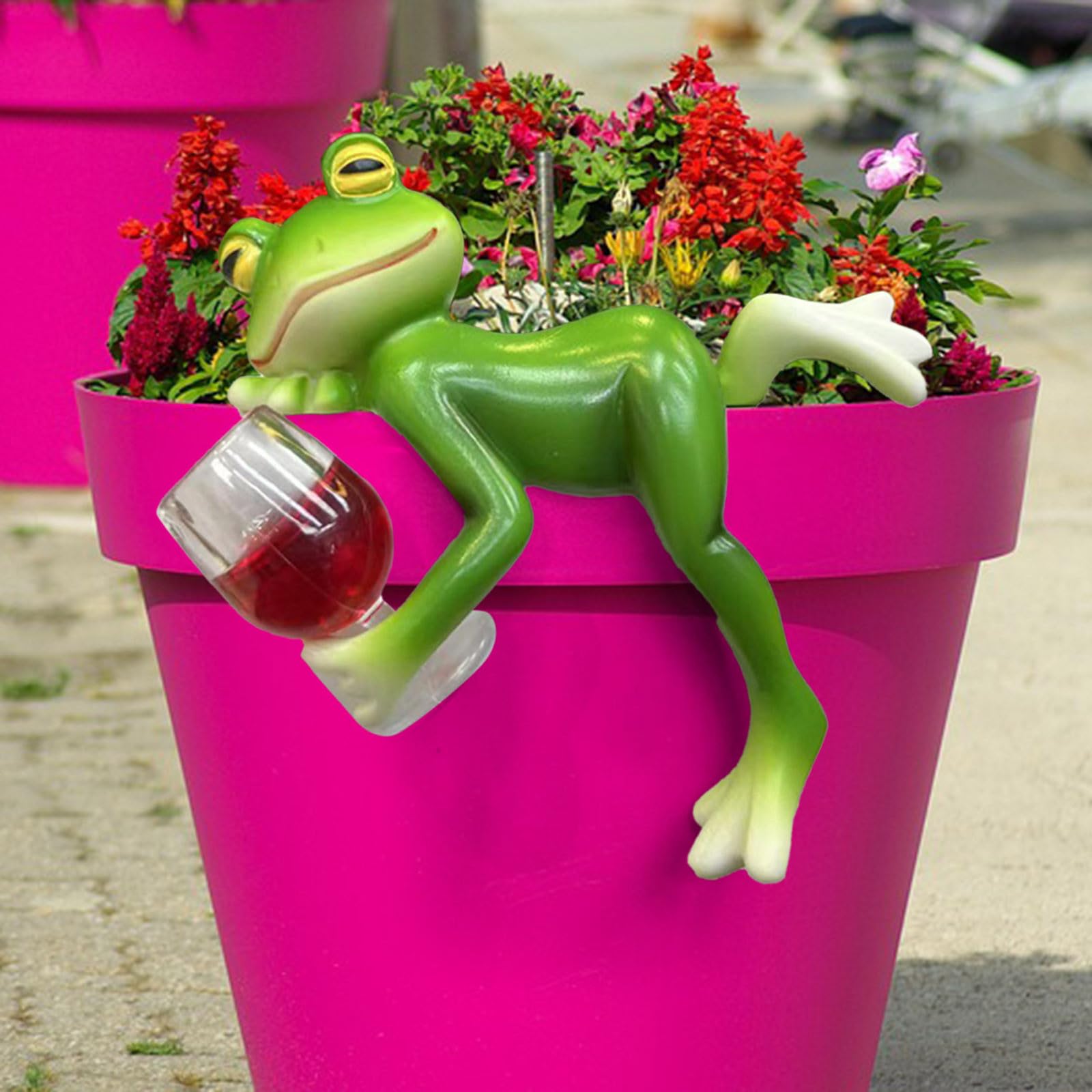 Diese lustige Froschstatue ist einfach genial! Der Frosch liegt da und trinkt gemütlich Rotwein - wie cool ist das denn? Mit 10x10 cm genau die richtige Größe für Töpfe, Blumenkübel oder als kleine Deko auf dem Balkon.\\n\\nAus hochwertigem Harz gefertigt - komplett wasserdicht, rissfest und verblasst nicht in der Sonne. Egal ob drinnen oder draußen, dieser Frosch hält alles aus. Die Farben sind schön kräftig und die Details wirklich realistisch ausgearbeitet.\\n\\nPerfekt um deinem Garten, deiner Terrasse oder deinem Zaun eine persönliche Note zu verleihen. Einfach auf den Rand eines Pflanzgefäßes setzen und sich an der charmanten Szene erfreuen.\\n\\nMacht einfach gute Laune - ob alleine oder in Gesellschaft von anderen Gartenfiguren. Ein kleines Kunstwerk das garantiert Gesprächsstoff bringt!