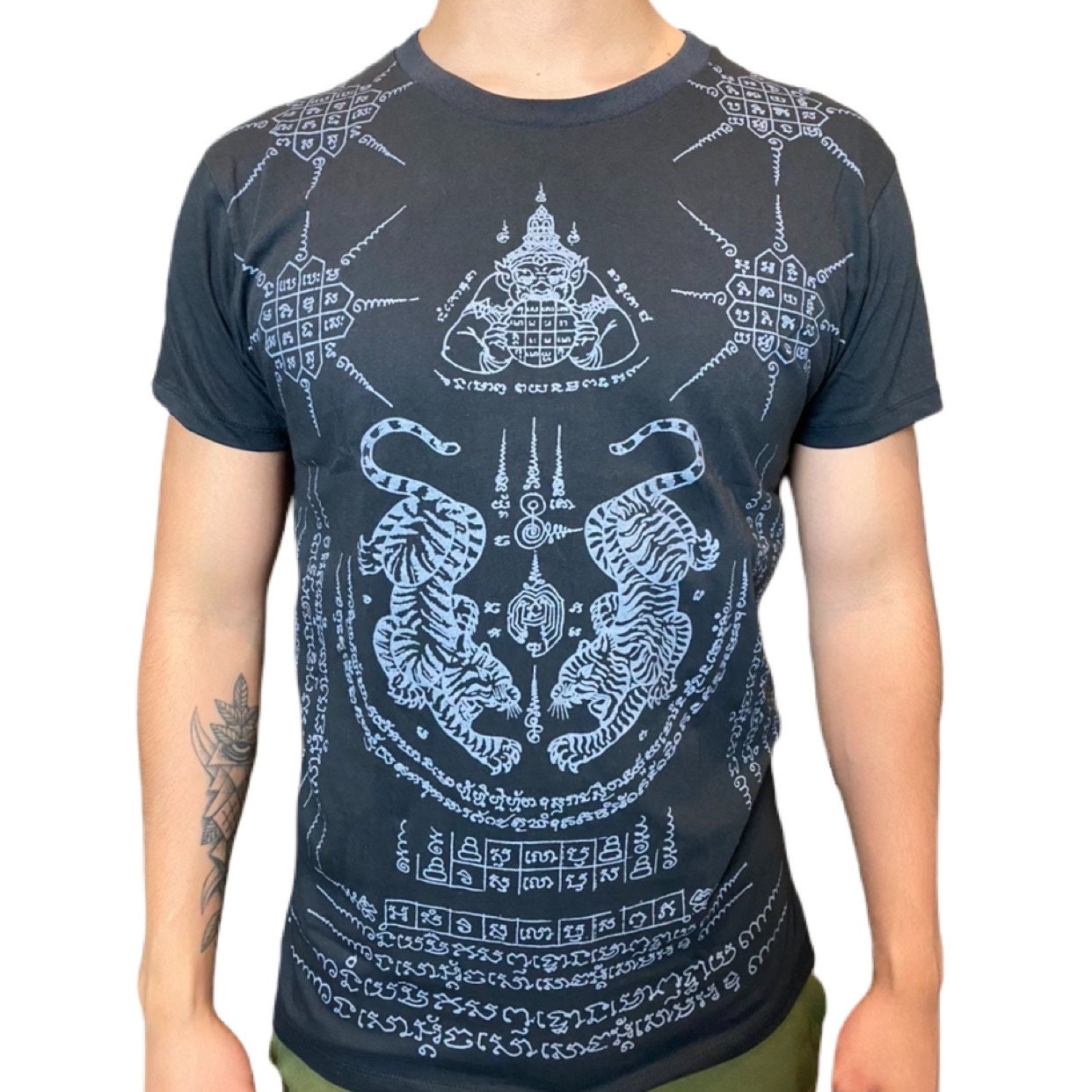 Für alle Muay Thai und Thailand-Fans: Dieses coole Twin Tiger Sak Yant Tank Top ist genau dein Ding! Das Design zeigt das magische thailändische Tiger-Tattoo, das für Stärke, Schutz und Kraft steht. Perfekt für Training, als Andenken an deine Thailand-Reise oder einfach als Statement-Shirt. Die doppelt genähten Ärmel und der Saum garantieren Langlebigkeit, und das leichte Material ist ideal für warme Tage. Ob du nun selbst kämpfst, Thai-Kultur liebst oder einfach nur stylisch unterwegs sein willst - mit diesem Top fällst du auf! Ein super Geschenk für Kampfsportler, Tattoo-Liebhaber oder alle, die asiatische Kultur mögen.