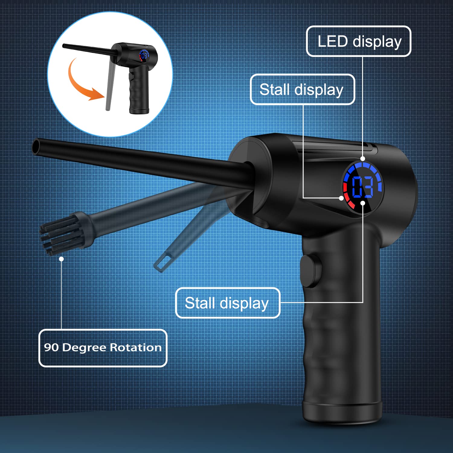 Power für perfekte Reinigung! Dieses elektrische Staubgebläse erreicht bis zu 150.000 U/min und bläst Staub und Krümel blitzschnell von allen Oberflächen. Mit 6000mAh Akku für bis zu 60 Minuten Laufzeit.