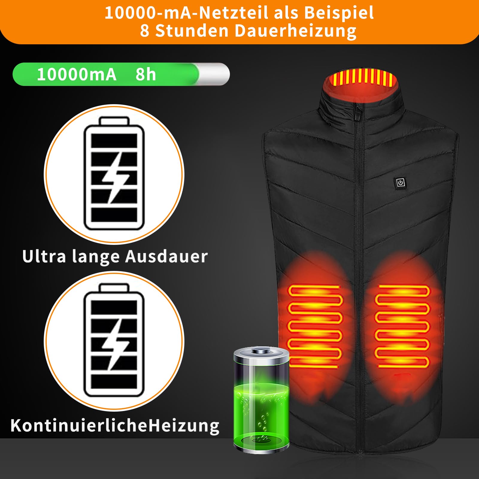 Brrr, ist das kalt? Nicht mit dieser genialen Heizweste! Mit 9 Heizzonen an Hals, Bauch, Schultern und unterem Rücken hält sie dich auch bei frostigen Temperaturen mollig warm. Drei Heizstufen ermöglichen dir die perfekte Temperatur anzupassen - von gemütlich warm bis richtig kuschelig! Per USB anschlussbar an Powerbanks (5V) - mit einer 10000mAh Powerbank hält die Wärme bis zu 8 Stunden! Super für Skiurlaub, Winterwandern, Radfahren oder den kalten Weg zur Arbeit. Aus atmungsaktivem Polyester gefertigt, bequem zu tragen und sogar maschinenwaschbar! Die Carbonfaser-Heizelemente sind sicher und hochtemperaturbeständig. Leicht und flexibel genug für volle Bewegungsfreiheit. Einfach Powerbank in die Tasche, Kabel anschließen und auf Wohlfühl-Temperatur einstellen - mehr Komfort im Winter geht kaum! Perfektes Geschenk für Outdoor-Enthusiasten und alle die keine Frostbeulen sein wollen!