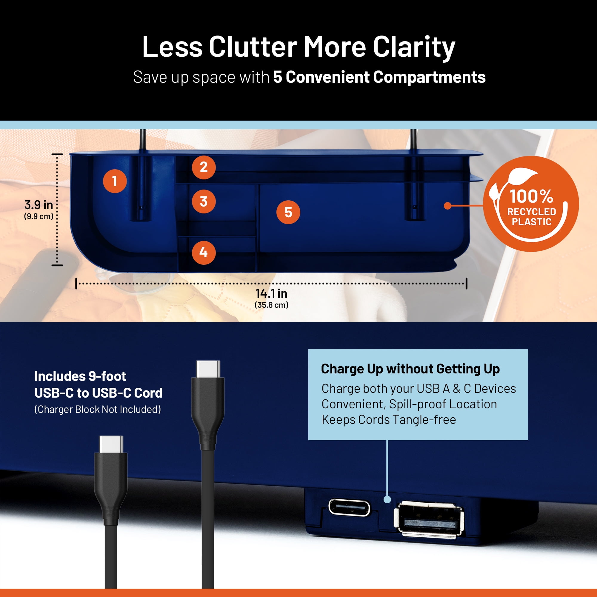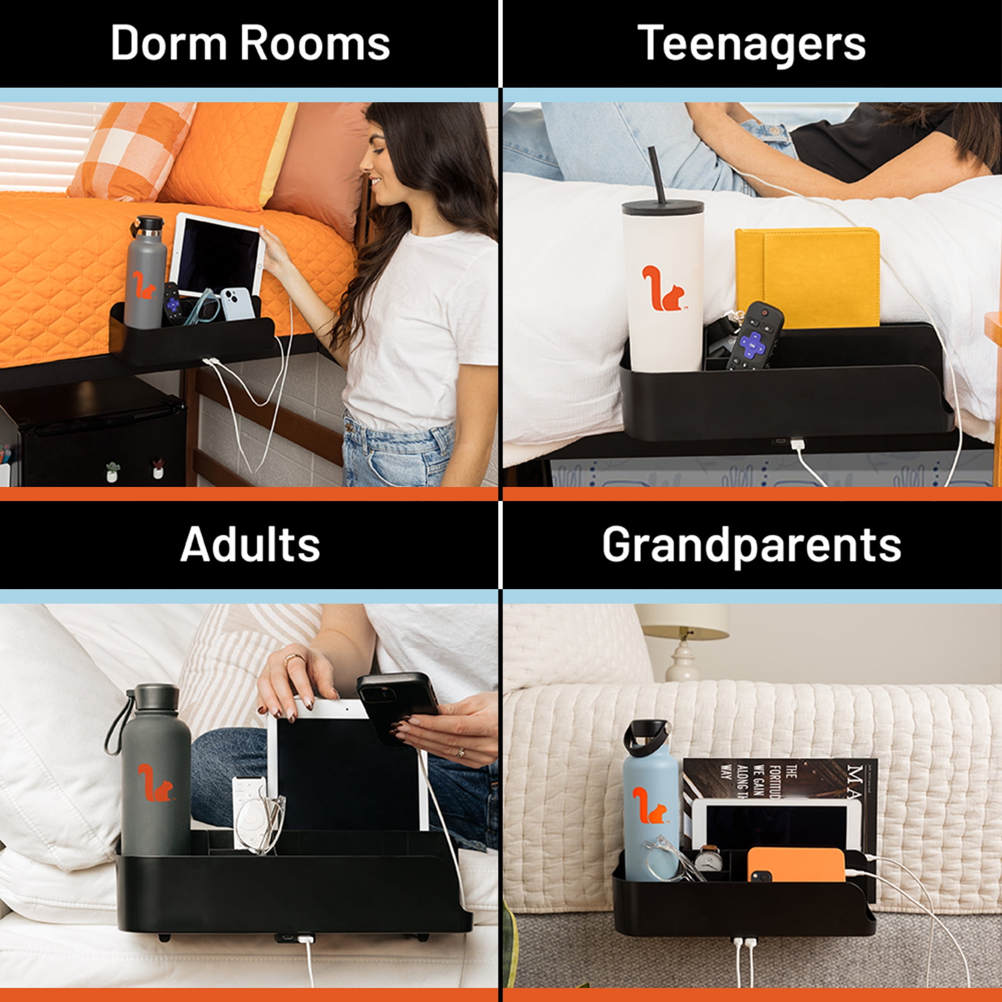 Schluss mit dem Chaos auf dem Nachttisch! Die Squirrel Nachttischstange ist der geniale Organizer für dein Schlafzimmer. Mit 5 praktischen Fächern für alles was du nachts brauchst: Handy, Buch, Brille, Wasserflasche - alles hat jetzt seinen festen Platz. Das absolute Highlight: Integrierte USB-C und USB-A Ladeanschlüsse! So laden sich deine Geräte direkt neben dir auf, ohne Kabelgewirr. Hergestellt aus 100% recyceltem Kunststoff - gut für die Umwelt und sieht dabei noch stylisch aus. Die Montage geht ratzfatz - werkzeuglos in nur 30 Sekunden! Einfach an den Bettrahmen oder die Couch klemmen und schon kann's losgehen. Perfekt für kleine Wohnungen, Schlafsäle oder WG-Zimmer wo Platz knapp ist. Abmessungen: 14,1x3,9x11,9 cm - kompakt aber super praktisch. Selbst deine 1-Liter-Wasserflasche findet hier Platz. Endlich alles griffbereit und aufgeräumt! Der einzige Caddy mit beiden USB-Anschlüssen - da bist du für alle Geräte gerüstet. Hol dir mehr Ordnung und Komfort in dein Schlafzimmer!
