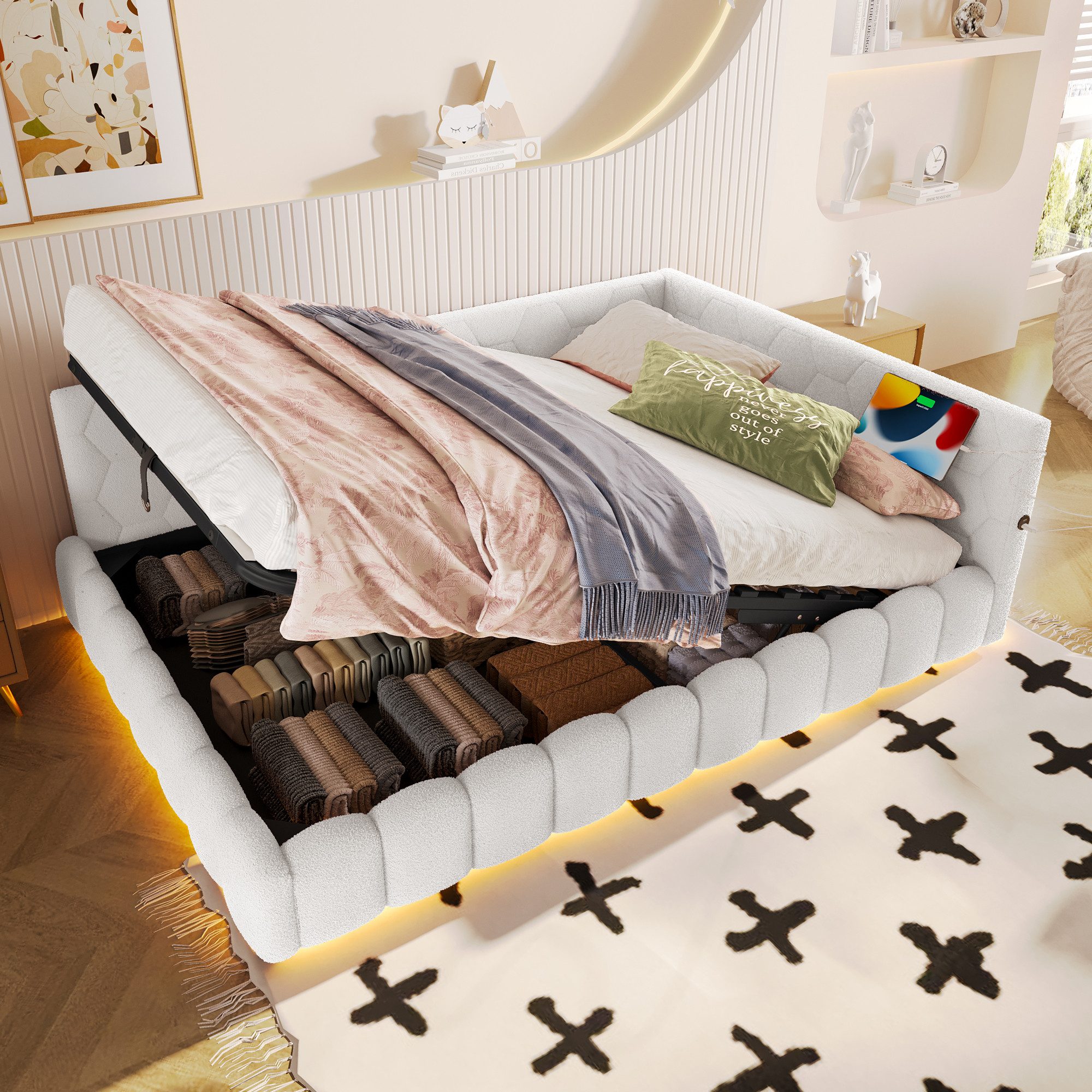 Dieses multifunktionale Sofa-Bett ist der absolute Platzsparer für jedes Gästezimmer oder Jugendzimmer! Tagsüber gemütliches Sofa, nachts bequemes 140x200cm Bett - perfekt für Übernachtungsgäste oder Teenager. Mit praktischer LED-Beleuchtung, die per Fernbedienung Farben und Helligkeit wechseln kann, und integriertem USB-Anschluss zum Laden von Handy & Co. Der stabile Lattenrost aus Holz und Metall hält bis zu 280kg aus. In schicker Samt-Optik in Beige erhältlich, verleiht es jedem Raum modernes Flair. Einfach montieren mit beiliegender Anleitung - allerdings ohne Matratze. Aus hochwertiger Kunstwolle und MDF gefertigt, ist es nicht nur schön, sondern auch langlebig. Deine Gäste werden begeistert sein!