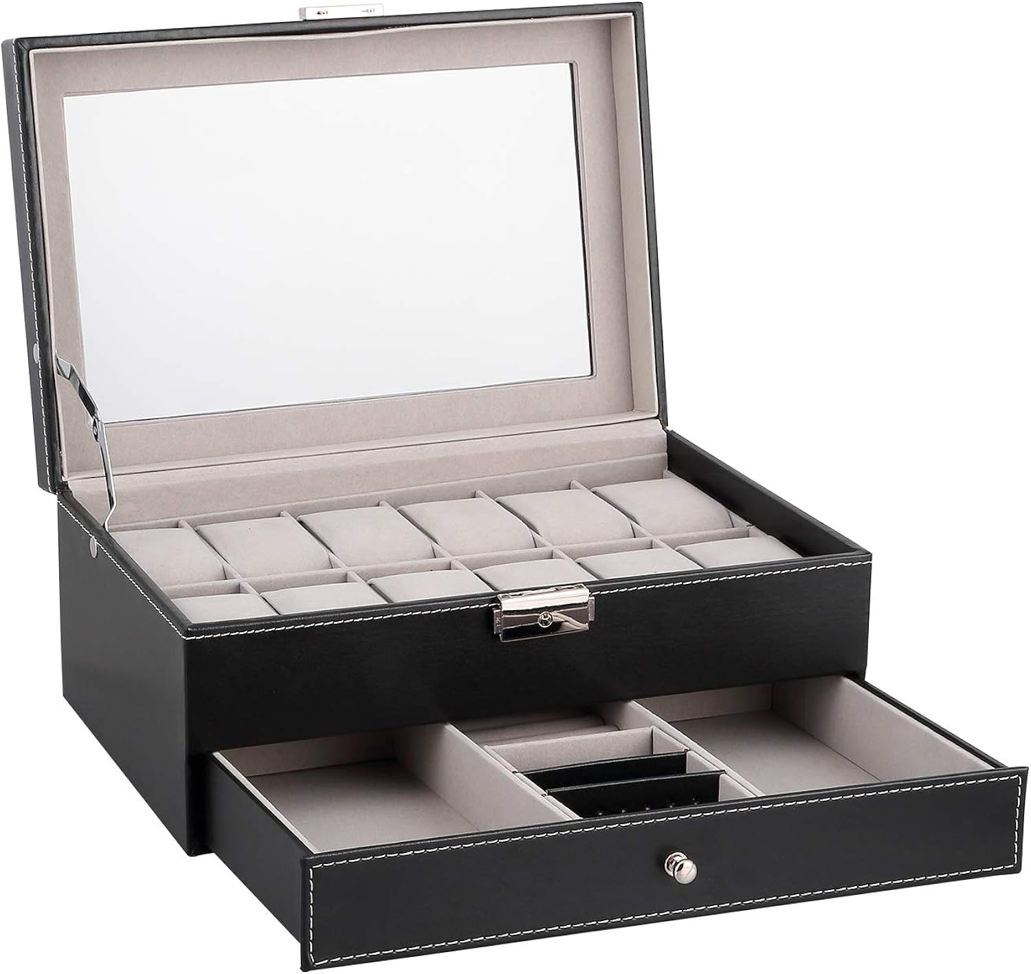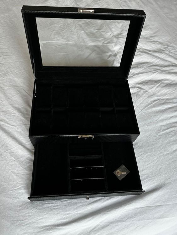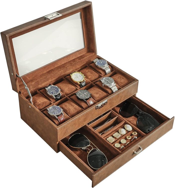 Wow, diese Uhrenbox ist echt was Besonderes! Mit 12 Fächern für deine wertvollen Uhren und einer extra Schublade für Schmuck, Armbänder und Ringe. Alles sicher verschlossen mit einem Metallschloss - deine Schätze sind bestens geschützt! Der braune Samt-Innenfutter fühlt sich super weich an und schützt vor Kratzern. Der Glasdeckel lässt dich deine ganze Sammlung bewundern, ohne dass Staub reinkommt. Die Metallscharniere sind mega stabil und die herausnehmbaren Kissen passen sich jeder Uhr an (bis 48 mm Zifferblatt). Perfektes Geschenk für Uhrenliebhaber! Sieht nicht nur edel aus, sondern hält deine wertvollen Stücke organisiert und sicher. Einfach reinsetzen, zuschließen und deine Uhren sind perfekt präsentiert!